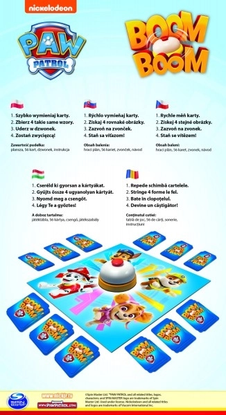 U přímořské zábavy s hrou Boom Boom Psi Patrol nezbytně potřebujete pouze svoje smysly a rychlé reakce. Hra probíhá najednou pro každého, kde se snažíte zaměnit své karty a získat čtveřici stejného typu co nejrychleji. Kdo jako první dosáhne svého cíle, stiskne zvonek, aby oznámil svůj úspěch!