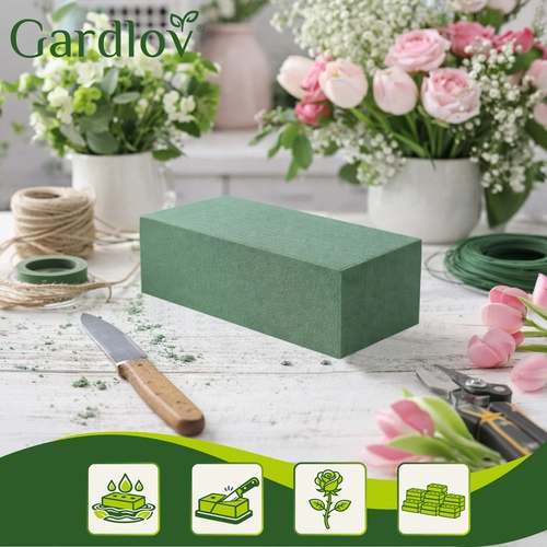 Vytvářejte stabilní květinové dekorace, které vydrží krásné delší dobu. Mokrá gąbka floristiky GARDLOV po správném nasáknutí vodou postupně hydratuje čerstvé květiny a současně fixuje stonky v přesně zvoleném úhlu. Rozměr 23 × 11 × 8 cm sedí do běžných nádob a lze jej jednoduše upravit nožem.