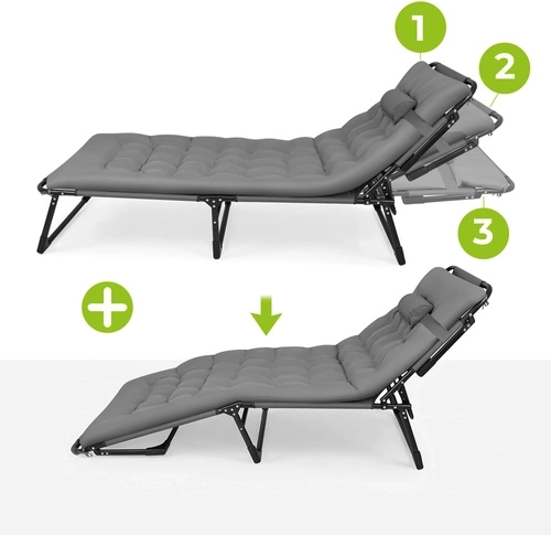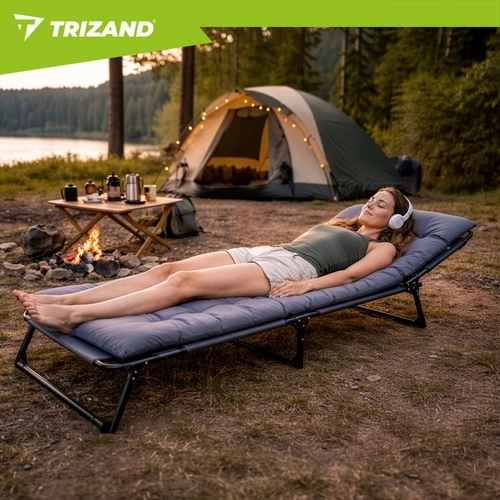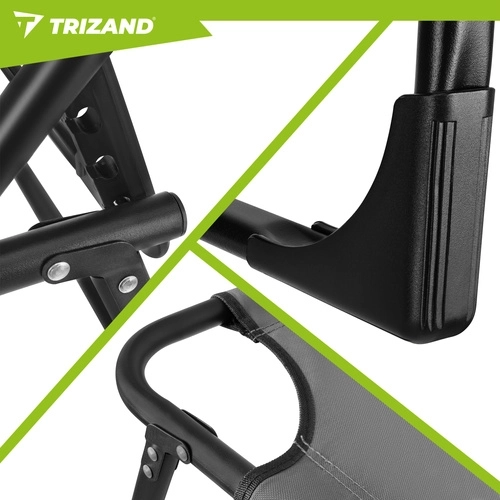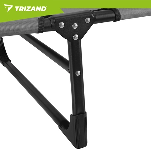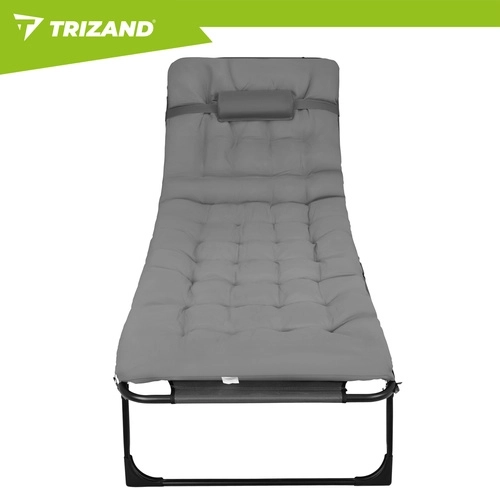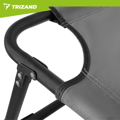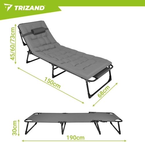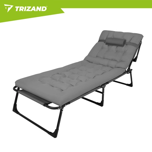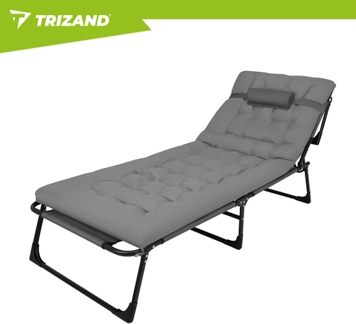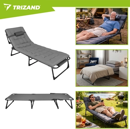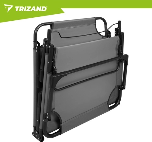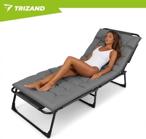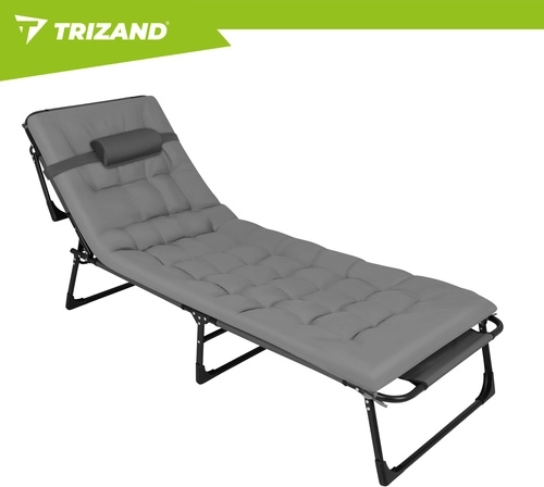 Užijte si relax na zahradě, terase i na pláži s lehátkem TRIZAND. Nabízí 4 polohy opěrky, skládací podnožku a měkký polstrovaný matrac s odnímatelným polštářem. Díky pevné ocelové konstrukci se 4 nohami unese až 120 kg, snadno se čistí (tkanina Oxford) a rychle se složí pro přepravu.