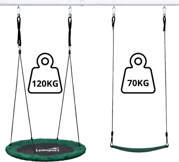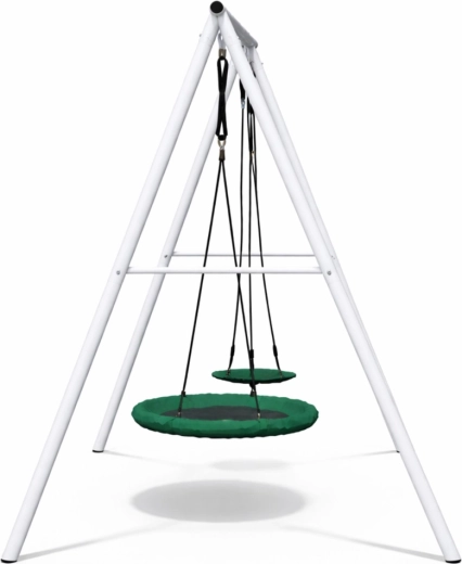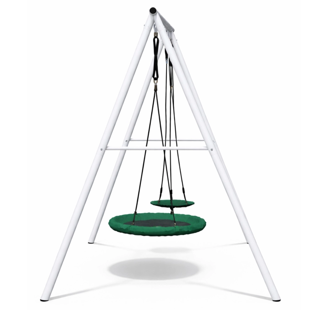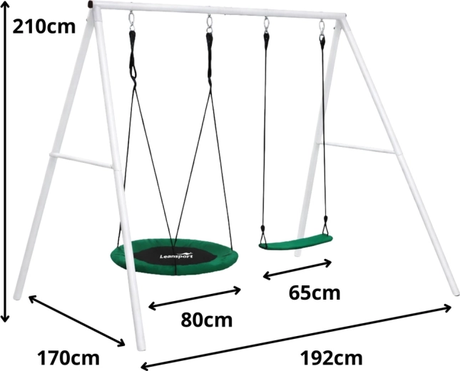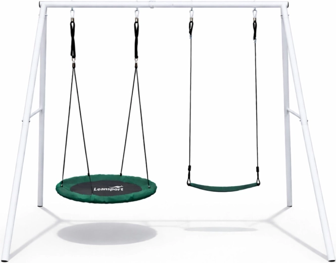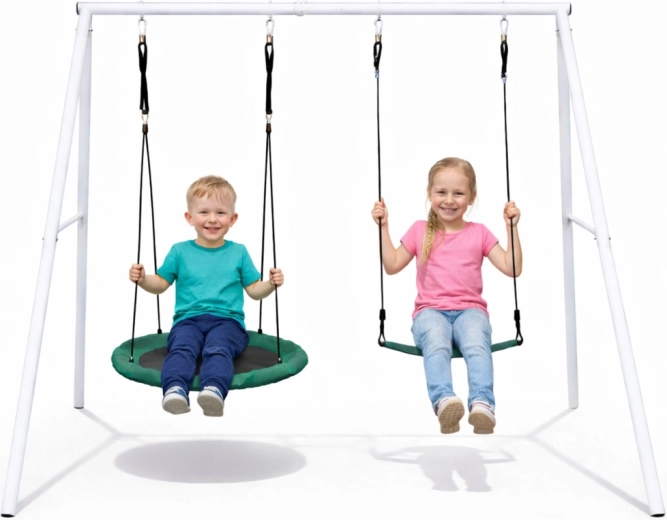Tato houpačka 2 v 1 kombinuje pohodlí a zábavu pro celou rodinu. Robustní bílý A‑rám z ocelových trubek drží dvě různá sedátka – prostorné hnízdo pro relax i hry a úzké klasické sedátko pro dynamické houpání. Díky výškově nastavitelným lanům (140–180 cm) snadno přizpůsobíte houpačku věku i výšce uživatele.