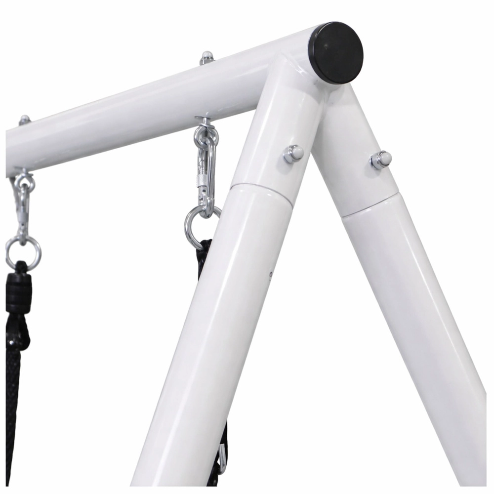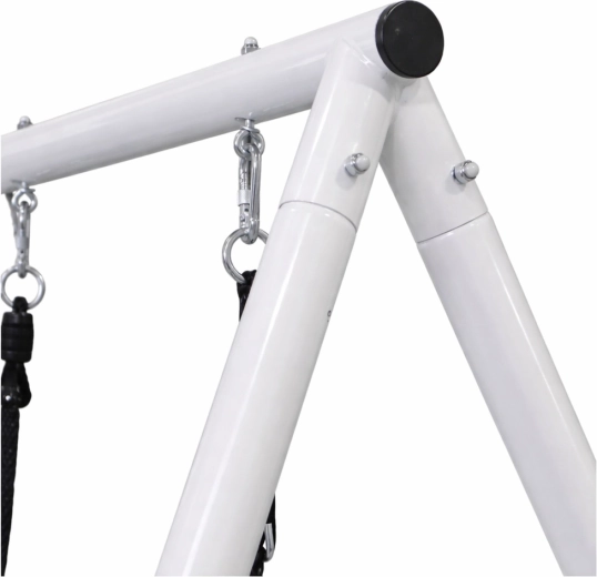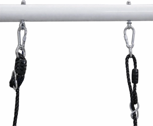 Bílý ocelový stojan, zesílené spoje a kvalitní karabiny a oka zajišťují pevné uchycení a plynulý chod bez vrzání.