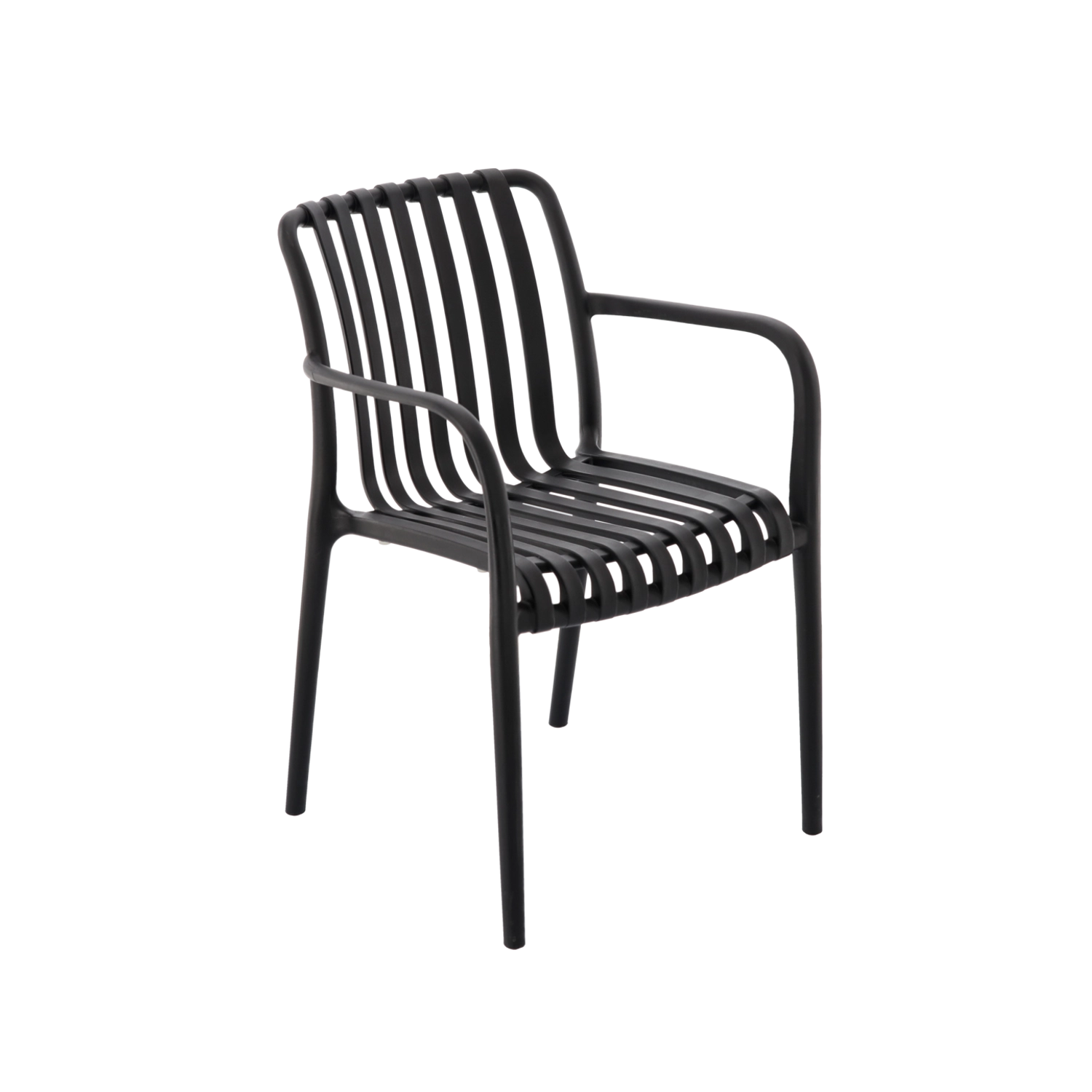Tato černá zahradní židle kombinuje jednoduchý design a praktické vlastnosti. Díky kvalitnímu plastovému materiálu s UV filtrem si dlouhodobě udrží barvu a vzhled i při pravidelném používání na přímém slunci. Je ideální pro venkovní posezení a nenáročná na údržbu.