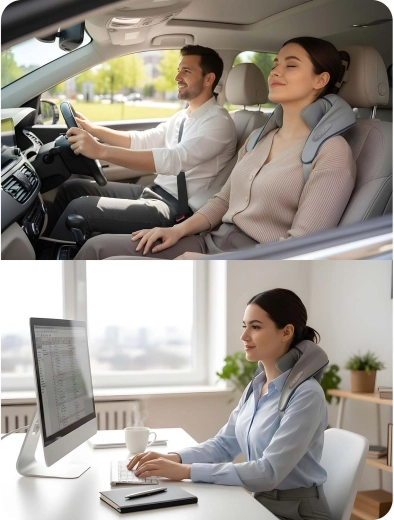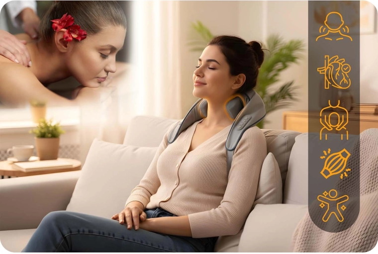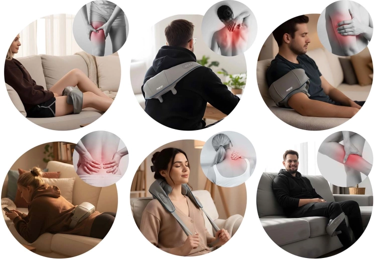 Masážní uzly rotují ve více směrech a napodobují dotyk rukou. Cíleně uvolňují zatuhlé svaly krku, šíje a zad, přinášejí úlevu od bolesti i stresu.
