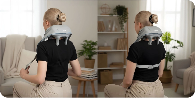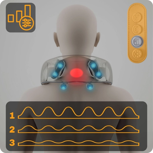 Intuitivní panel vám umožní jedním dotykem přepínat 3 úrovně intenzity, směr rotace i vyhřívání. Díky nastavitelným páskům snadno upravíte tlak – buď ručně přitáhnete, nebo využijete zadní popruh pro hands‑free relax. Přístroj je ideální pro krk a šíji, ramena, záda a bedra, ale i pro stehna a lýtka po sportu či dlouhém sezení.