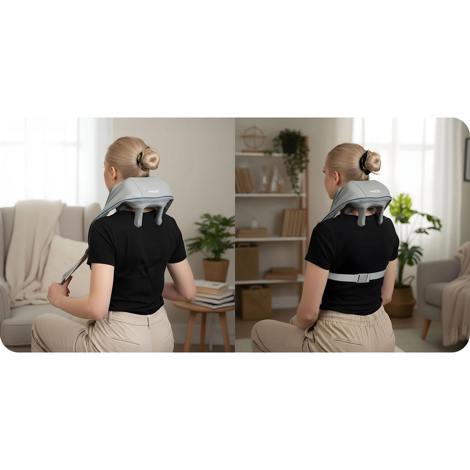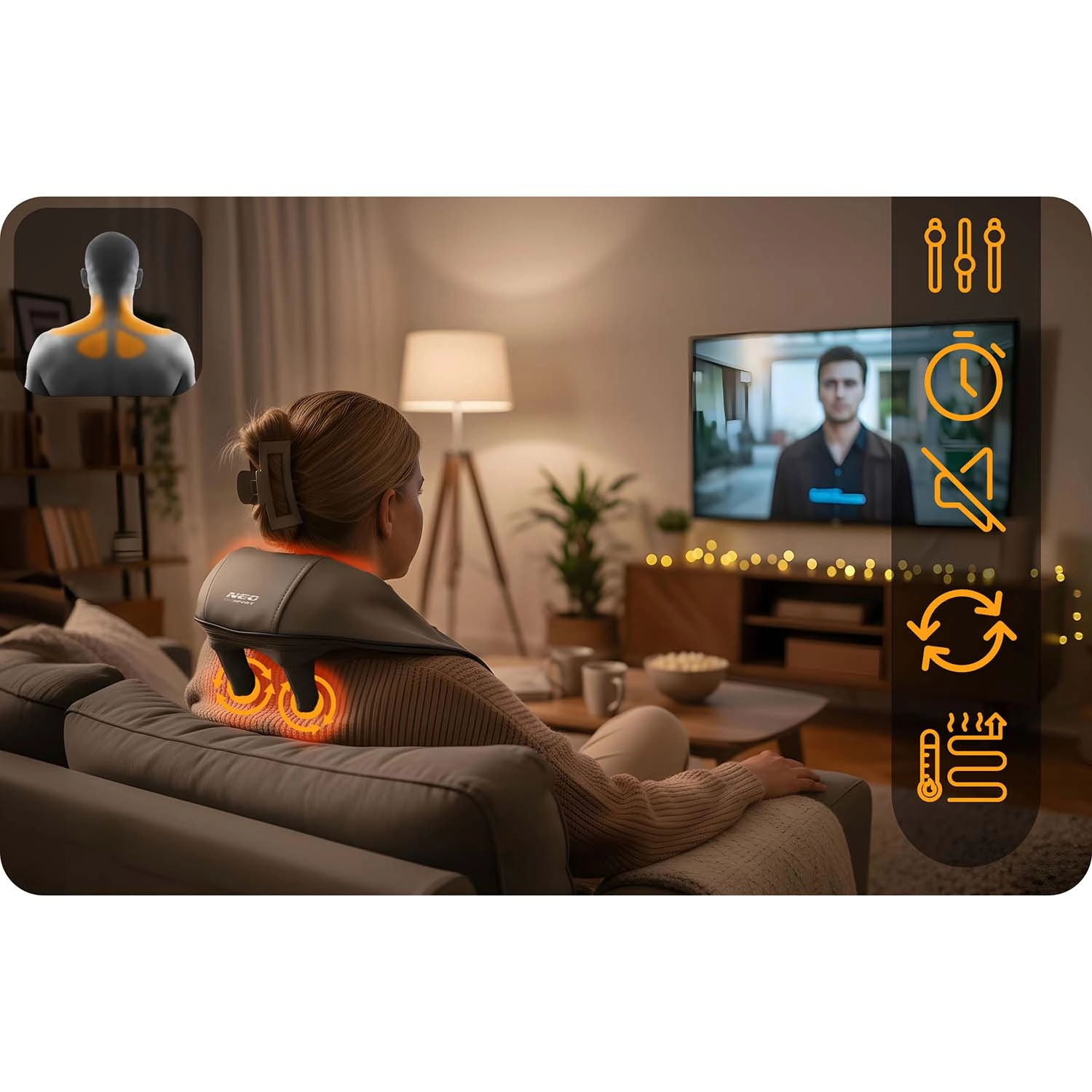 Zažijte masáž jako z rukou profesionála. Tento ergonomický masážní přístroj věrně napodobuje techniku shiatsu – hluboké hnětení účinně uvolní krční páteř, trapézy, lopatky i bedra. Vyhřívání podporuje cirkulaci krve, zjemňuje ztuhlé svaly a zvyšuje efekt relaxace, zatímco bezdrátové provedení a nabíjení přes USB‑C přináší svobodu použití.