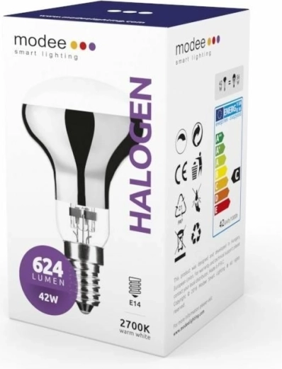 Úsporná halogenová žárovka R50 s paticí E14 a příkonem 42 W nabízí okamžitý plný jas, stmívatelný světelný tok 624 lm a teplé bílé světlo 2700 K. Díky širokému vyzařovacímu úhlu 120° skvěle osvítí místnost a speciální konstrukce s IR odrazem zvyšuje účinnost. Energetická třída C, životnost až 2000 h.