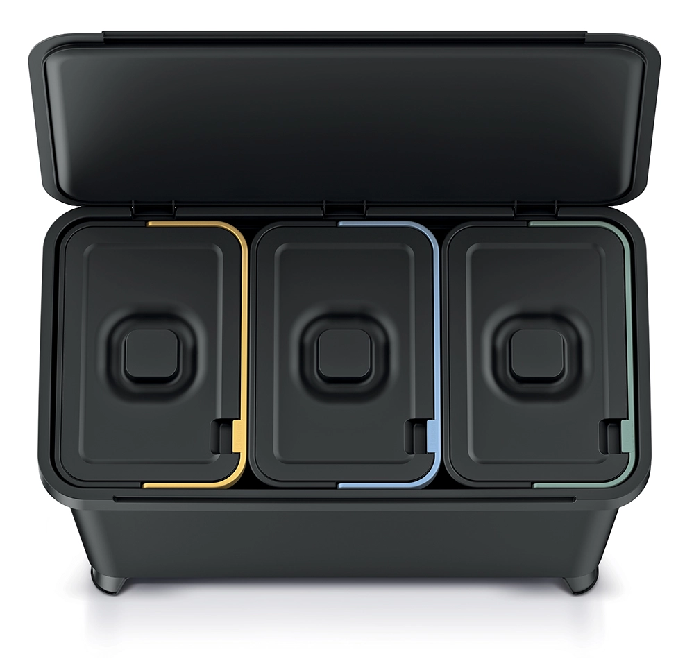 Tři samostatné vložky (žlutá/plast, modrá/papír, zelená/sklo) s víky a barevnými okraji zrychlí správné třídění a udrží domácnost v pořádku.