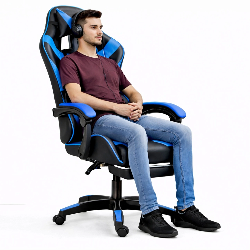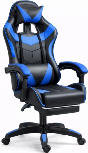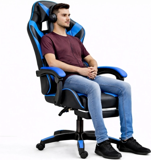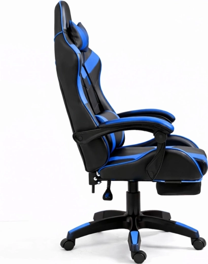 Ergonomická herní židle LEAN v elegantní černo‑modré kombinaci nabízí vysoké opěradlo s hlavovou a bederní opěrkou, sklopné opěradlo až do 135°, výškové nastavení a vysouvací podnožku pro maximální pohodlí při hraní i práci. Odolná eko kůže, otočná základna 360° a stabilní pěti-ramenný kříž s kolečky zajišťují komfort a snadnou mobilitu i při dlouhém sezení.