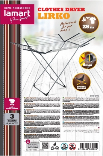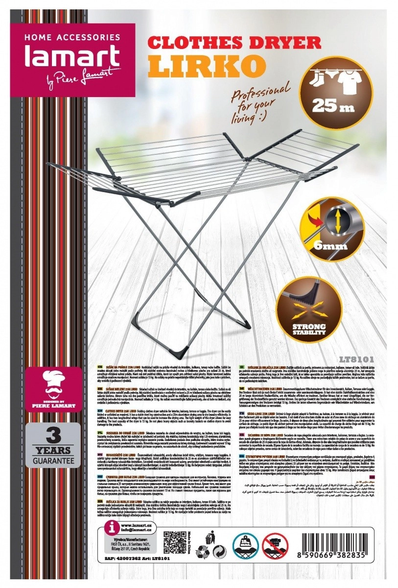 Univerzální sušák na prádlo LIRKO je spolehlivým řešením pro každodenní sušení v bytě i venku. Robustní ocelové nohy zajišťují stabilitu, zatímco hliníkové tyče s celkovou plochou 25 metrů poskytují dostatek místa pro efektivní proudění vzduchu a rychlé schnutí.