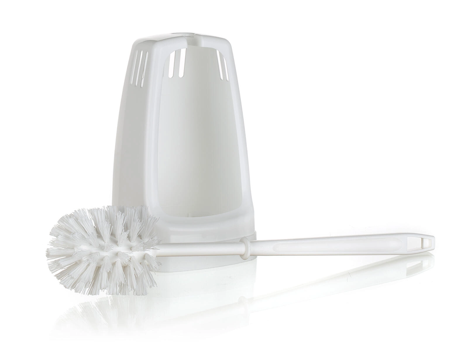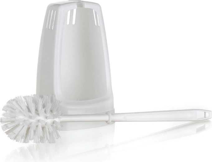 Praktická WC souprava s čtvercovým držákem pro každodenní hygienu toalety. Nabízí kompaktní rozměry, odolný plastový materiál a štětku o průměru 7 cm se syntetickými vlákny pro účinné čištění. Součástí je zarážka na rukojeti, která drží štětku pevně v držáku.