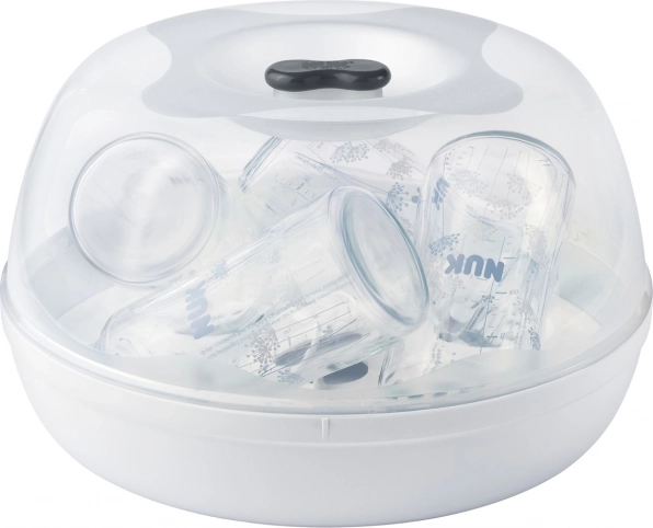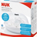 NUK Micro Express Plus je parní sterilizátor do mikrovlnné trouby, který se postará o spolehlivou dezinfekci kojeneckých lahví a příslušenství během pár minut. Díky chytrému držáku pojme až 4 lahve o objemu 300 ml se širokým hrdlem a udrží je ve správné poloze pro efektivní sušení. Průhledné víko a nový blokovací systém zajišťují bezpečné a přehledné používání.