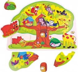 Vkládačka má tvar stromu a obsahuje 11 samostatných dílků se zvířátky a pevnou základnu. Díky odolné překližce je ideální pro každodenní používání doma i ve školce.