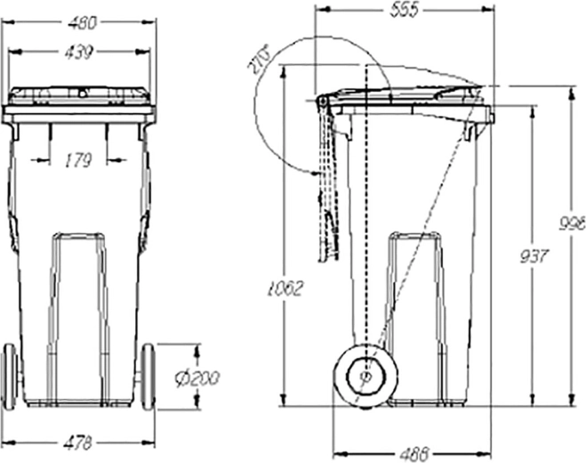 Popelnice je kompatibilní se standardními výsypnými systémy DIN a díky dvěma zadním kolům o průměru 200 mm se s ní velmi snadno manipuluje i po nerovném povrchu. Utěsněné víko pomáhá omezit šíření zápachu a vstup škůdců. Produkt splňuje normu EN 840 a specifikaci RAL-GZ 951/1:2013. Hladina hluku při manipulaci odpovídá směrnici 2000/14/ES a činí 79,1 dB (deklarace CE, zkoušky TÜV).