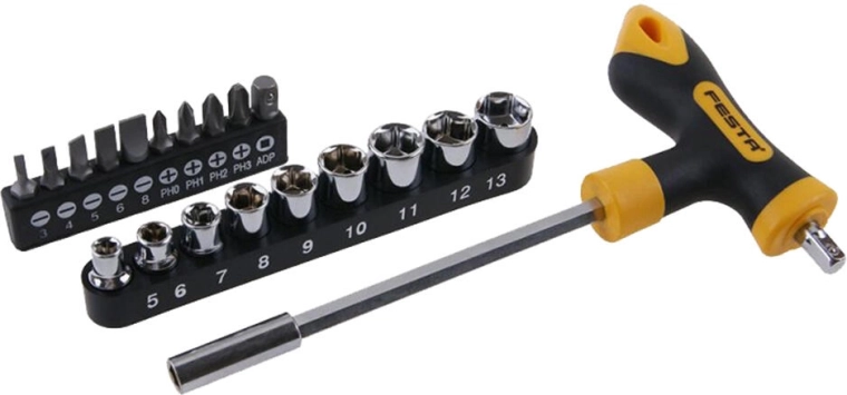 - Šroubovák s rukojetí T + sada bitů a hlavic
