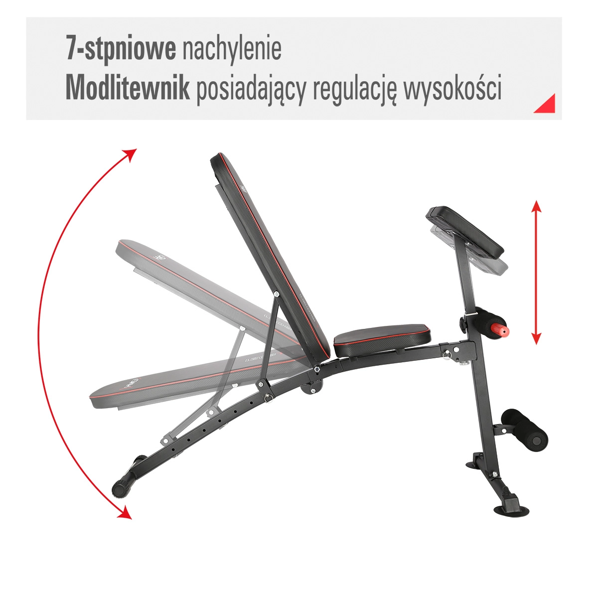 Robustní ocelová konstrukce s nosností 150 kg a stabilizátory s gumovými koncovkami poskytují jistotu při každém opakování. Lavice se dá jednoduše složit a díky hmotnosti 9,5 kg ji snadno přemístíte a uskladníte. Čalounění ze syntetické kůže s neklouzavým povrchem zvyšuje pohodlí a hygienu při cvičení, zatímco praktická poutka na přední noze umožní připojit dodávané gumové expandéry pro variabilní trénink paží.