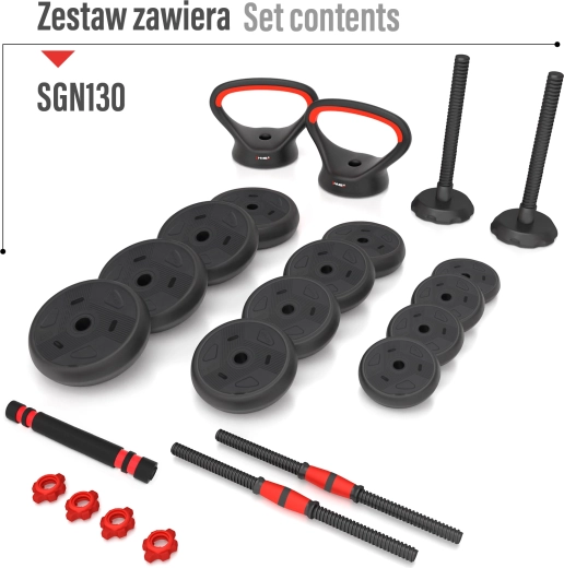 Sada nakládacích činek HMS SGN130 Pro 6v1 promění vaši domácí posilovnu v univerzální tréninkovou stanici. Jednoduchým kombinováním dílů sestavíte jednoruční i obouruční činku, stabilní kettlebell nebo činku s paralelním a bočním úchopem. Madla lze navíc použít samostatně jako podpěry na kliky pro bezpečnější a hlubší rozsah pohybu.