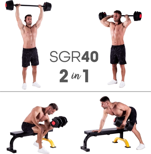 HMS SGR40 Pro set řeší problém mnoha nakládacích činek. Zátěž nastavíte jednoduše otočením rukojeti, hodnoty v kg i lb jsou přehledně označené. Zvolená kombinace kotoučů se automaticky uzamkne, zbytek zůstává ve stojanu – bez zdlouhavého přehazování a dotahování matic.