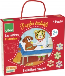 Tato sada obsahuje čtyři vývojová puzzle s motivy různých povolání, navržená tak, aby děti motivovala k postupnému zlepšování. Díky rozdílnému počtu dílků si malé ručičky osvojí správné techniky skládání a naučí se rozpoznávat tvary i barvy.
