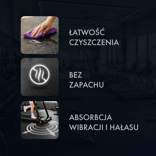 Každá deska o rozměru 1 × 1 m a tloušťce 25 mm je vybavena montážními spojkami, které zabraňují posunu a udržují plochu kompaktní. Podlaha je ideální pod silové a kardio stroje, do zón s volnými váhami, pro funkční a cross‑training, ale i do garáží, skladů či průmyslových prostor.