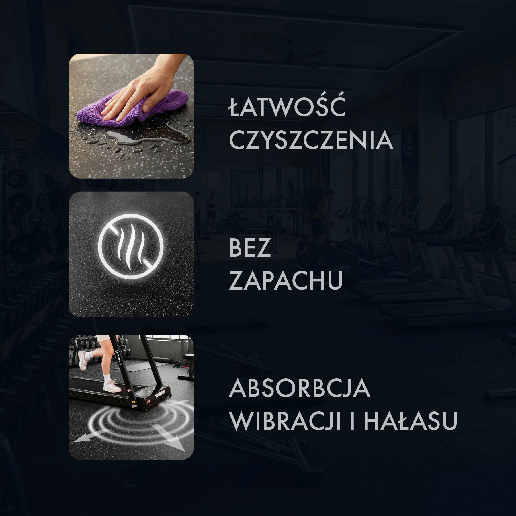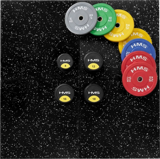 Gumová podlaha HMS POS25 je navržena pro vysokou zátěž a intenzivní provoz. Díky směsi recyklované SBR gumy a EPDM částic v černo-bílé kombinaci skvěle tlumí nárazy, snižuje hlučnost a chrání podklad i fitness vybavení. Protiskluzová struktura zvyšuje bezpečnost a komfort při cvičení, zatímco barevné EPDM tečky maskují nečistoty a udržují povrch dlouhodobě estetický.