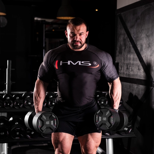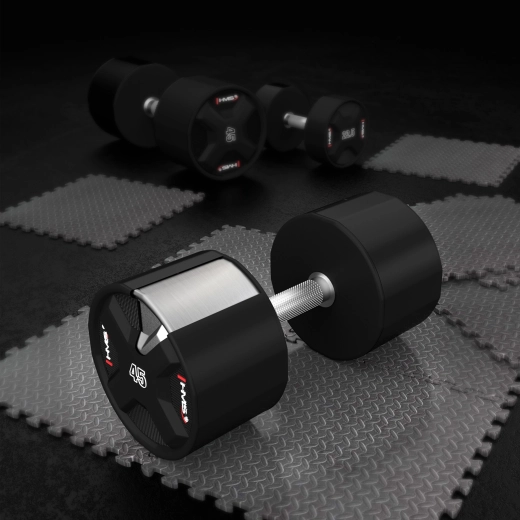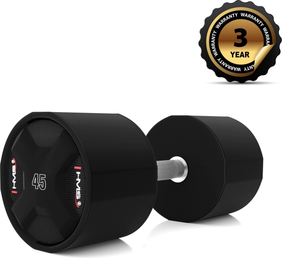 HMS polyuretanová jednoručka 45 kg kombinuje robustní ocelové jádro s litým polyuretanem (CPU) pro maximální životnost, stabilní tvar a minimální údržbu. Chromovaná, rýhovaná rukojeť jistí pevný úchop i při nejtěžších sériích, takže se můžete soustředit na výkon a techniku.