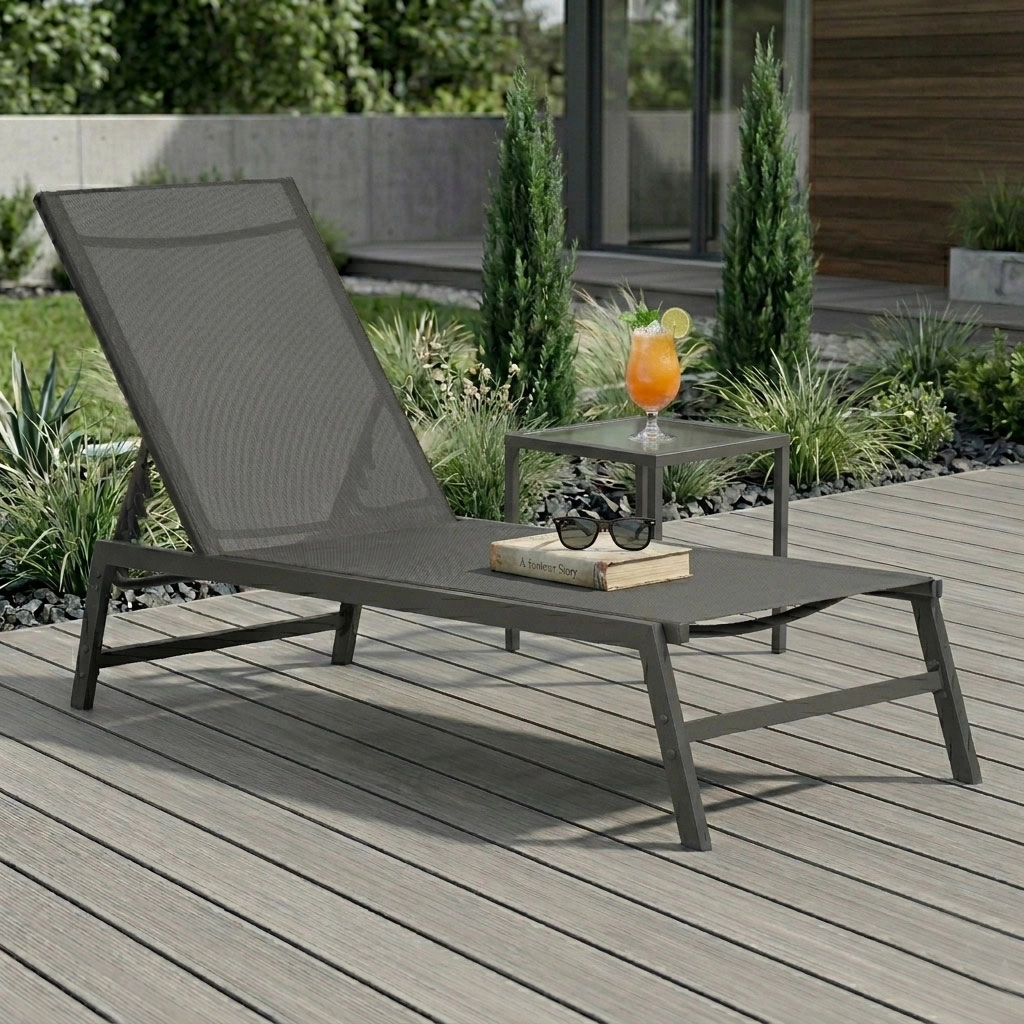 Elegantní zahradní lehátko MultiGarden nabízí 4 úrovně nastavení opěradla, možnost zcela rovné polohy a pevnou ocelovou konstrukci s prodyšnou textilenovou síťovinou. Díky protiskluzovým koncovkám je stabilní a odolá počasí, ideální na terasu, balkon i k bazénu. Nosnost 120 kg.