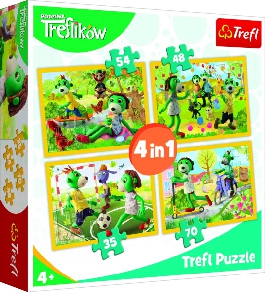 Udělejte radost dětem barevnou sadou 4 nezávislých puzzlí s motivy oblíbeného seriálu Rodina Treflíků. Každý obrázek má jiné množství dílků, takže si přijdou na své začátečníci i mírně pokročilí skládači. Díky speciálnímu papíru, který odráží světlo, se dílky lépe rozlišují a skládání je příjemnější.