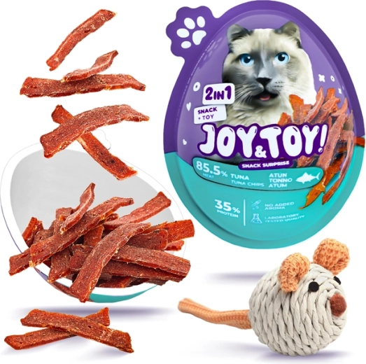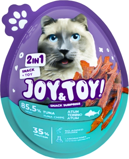 Objevte zábavu i odměnu v jednom: JOY&TOY! vajíčko kombinuje lahodné tuňákové masíčko s překvapivou hračkou. Každé balení skrývá jiný model – více než 100 možností pro radost a aktivní hraní. Snack je vyráběn šetrným sušením, bez barviv, cukru a dochucovadel, s přirozenou chutí a vůní, kterou si kočky zamilují.