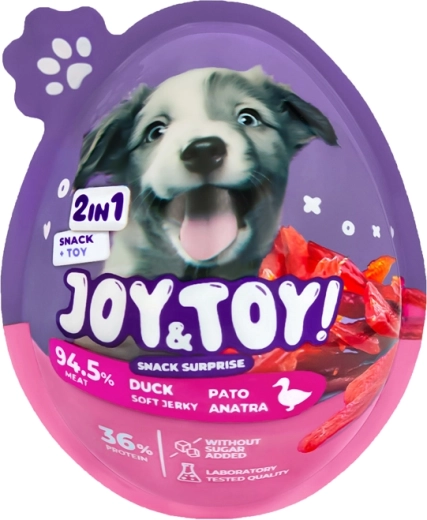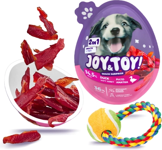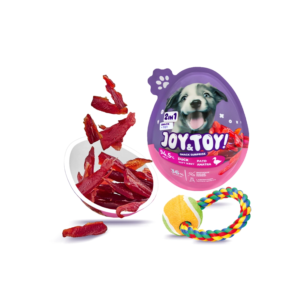 Joy&Toy vajíčko přináší dvojnásobnou radost: prémiový masový pamlsek a kvalitní hračku pro psy (některé varianty potěší i kočky). Měkké kachní jerky s vysokým podílem masa nabízí přirozenou chuť a vůni, jsou bohaté na bílkoviny a vyráběné pečlivě kontrolovaným sušením. Každé vajíčko skrývá jinou hračku – od dentálních přes gumové až po plyšové – pro zábavu, trénink a relax.
