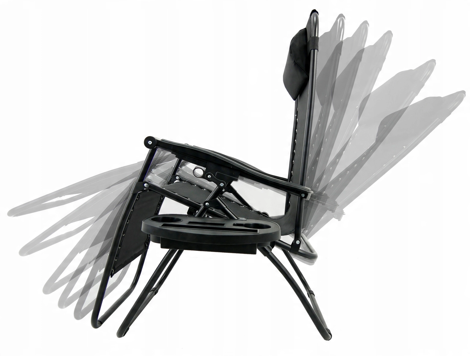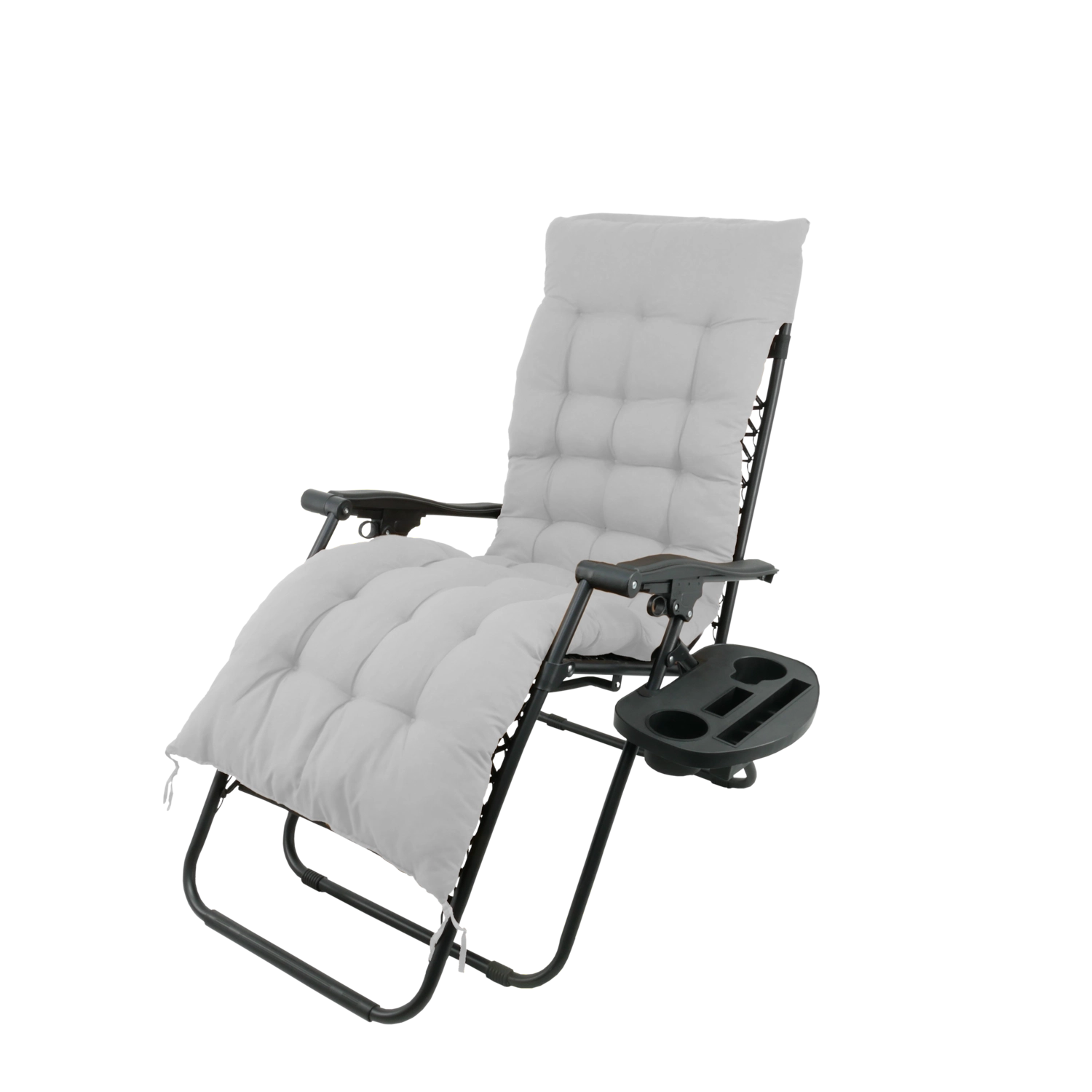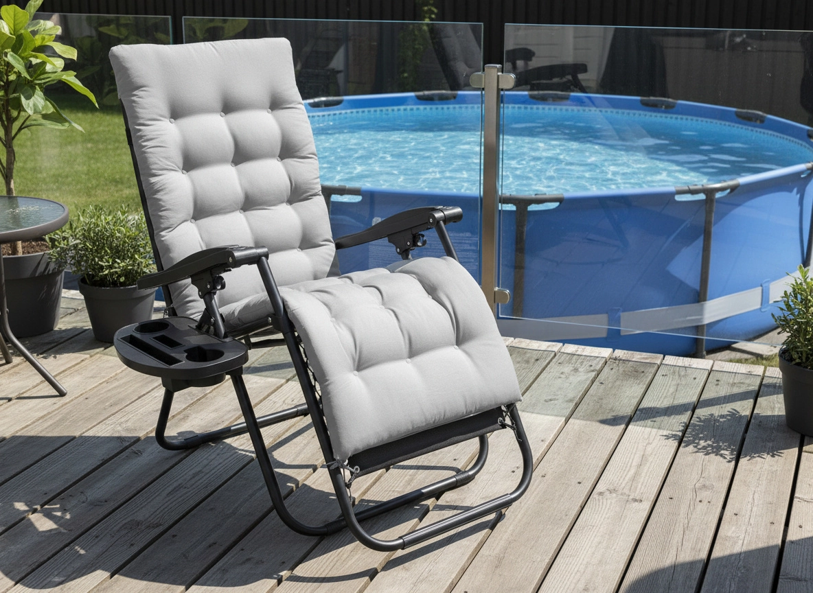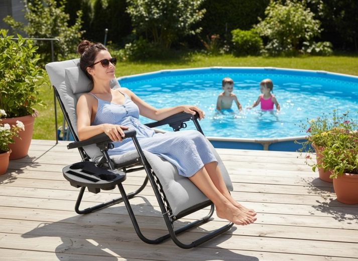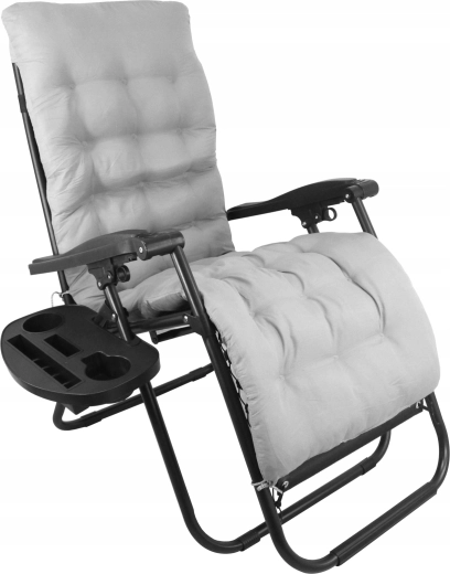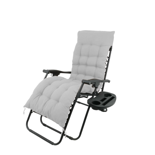 Elegantní relaxační lehátko kombinuje odolný ocelový rám s prodyšnou tkaninou 1x2 Textilene a měkkým šedým polštářem. Snadno si nastavíte optimální polohu ležení a díky skládacímu mechanismu lehátko jednoduše přenesete i uložíte. Praktický odkládací stolek u opěrky pojme nápoj, telefon či drobnosti, abyste měli vše po ruce.