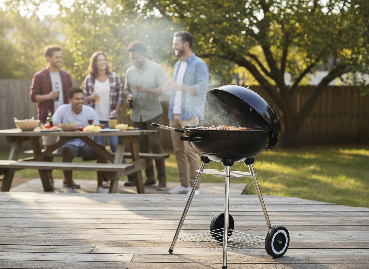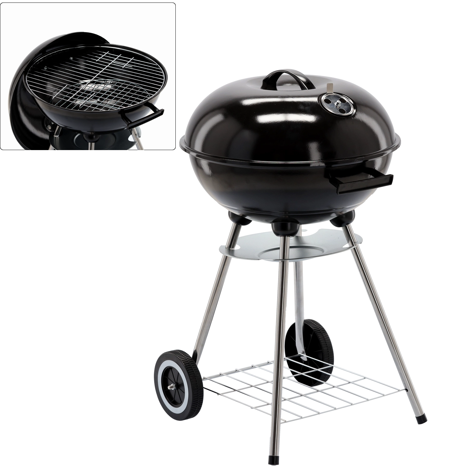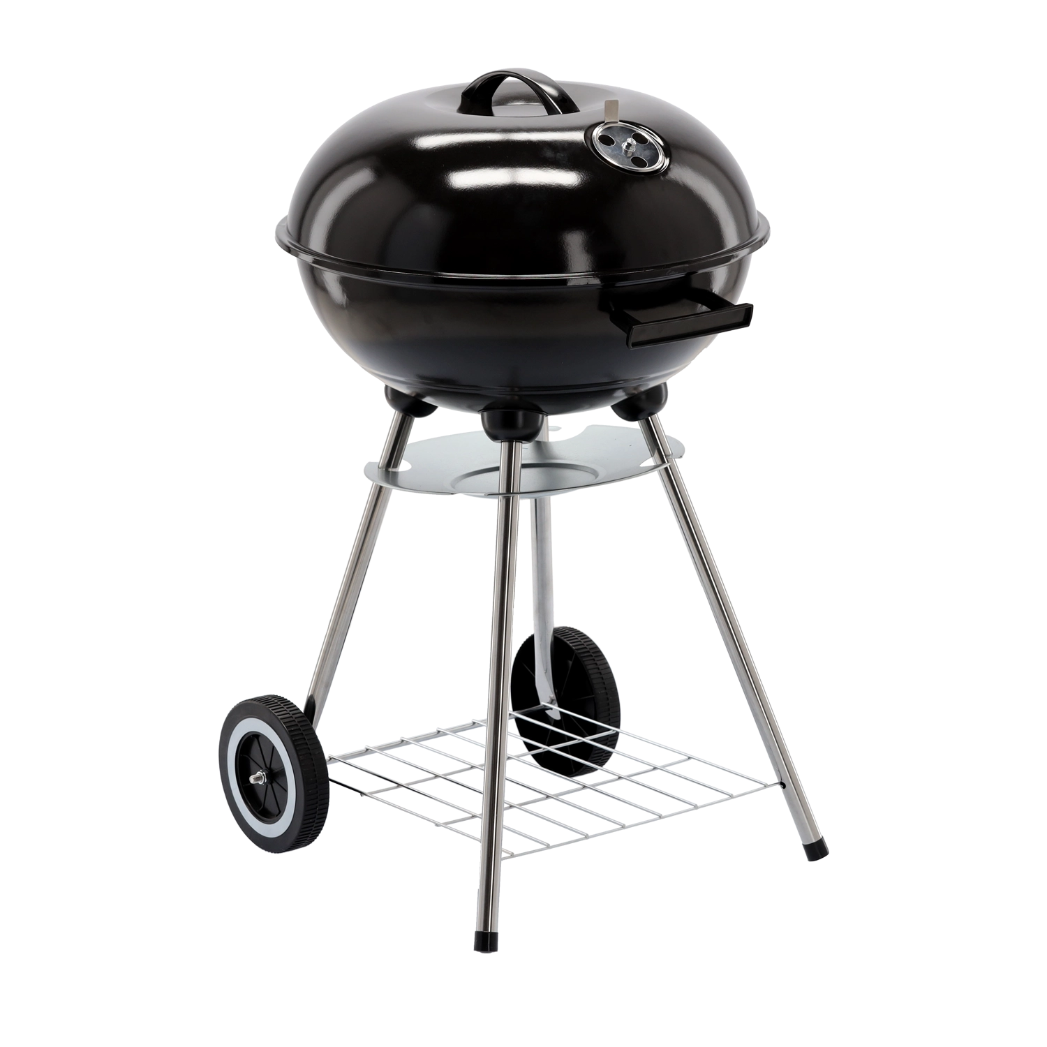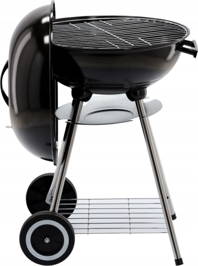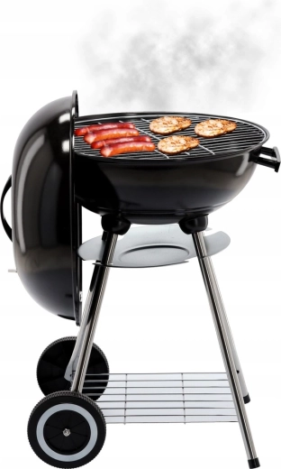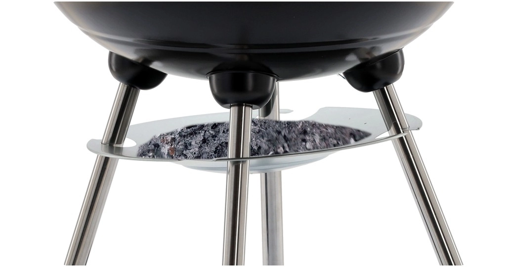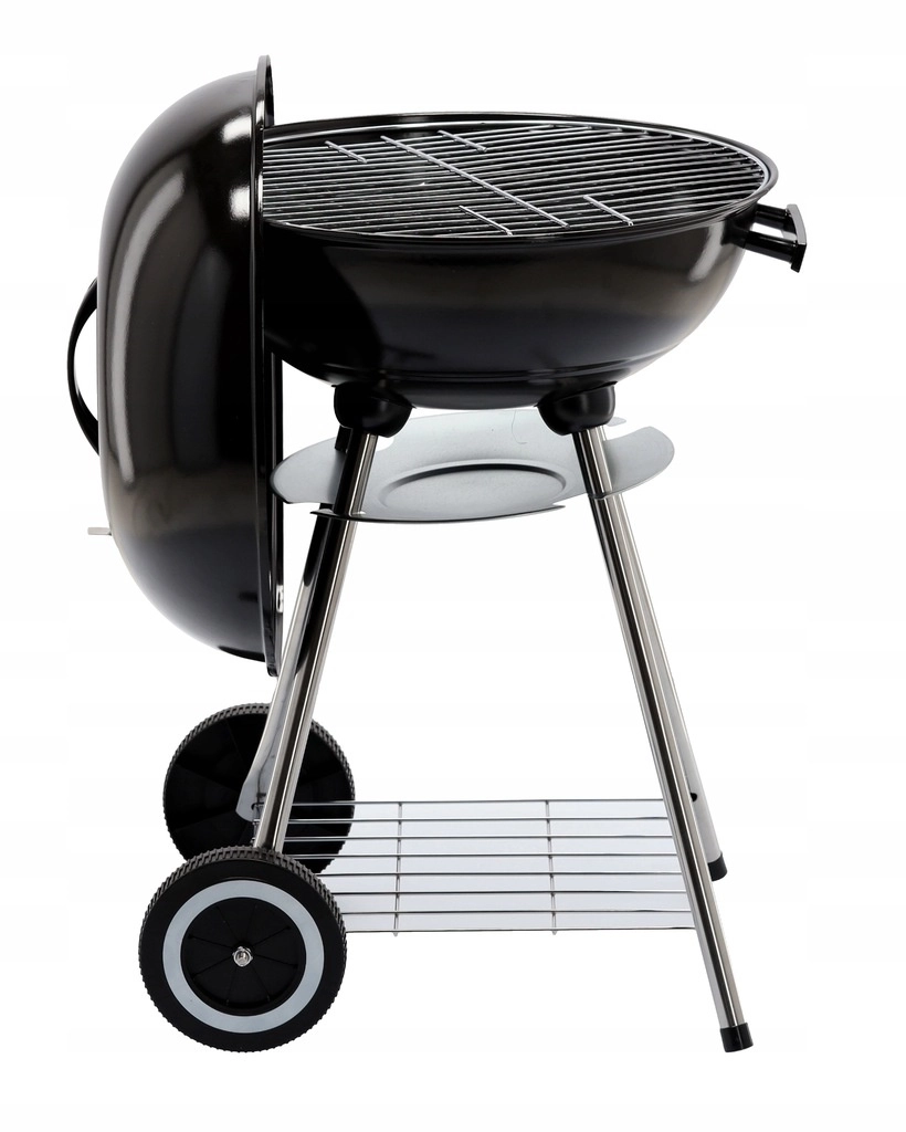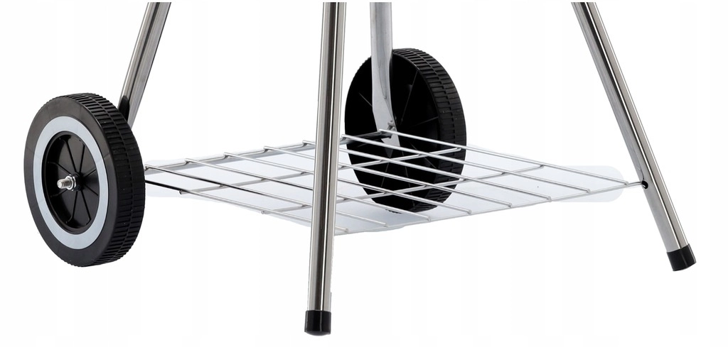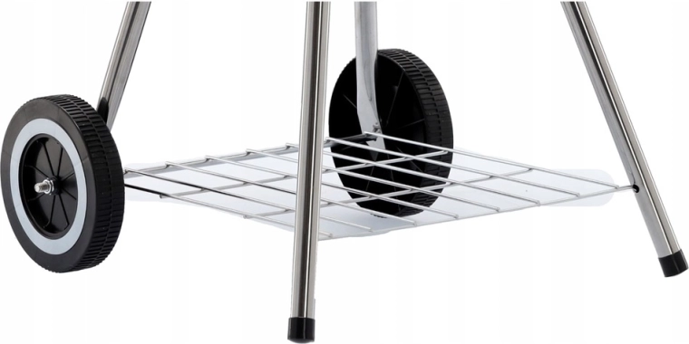 Praktická konstrukce s dvěma kolečky umožňuje snadné přemístění, spodní drátěná police udrží palivo a náčiní po ruce a popelník zjednodušuje čištění po každém grilování. Stabilní trojnožka s kovovými nohami dodává grilu jistotu i na nerovném povrchu.