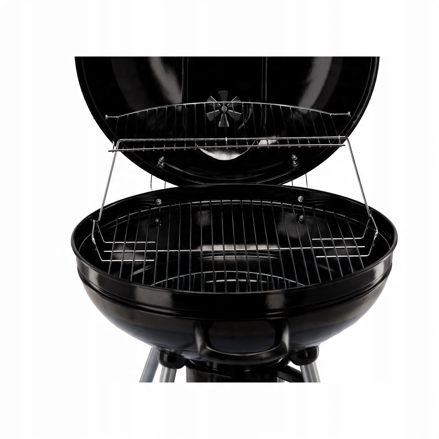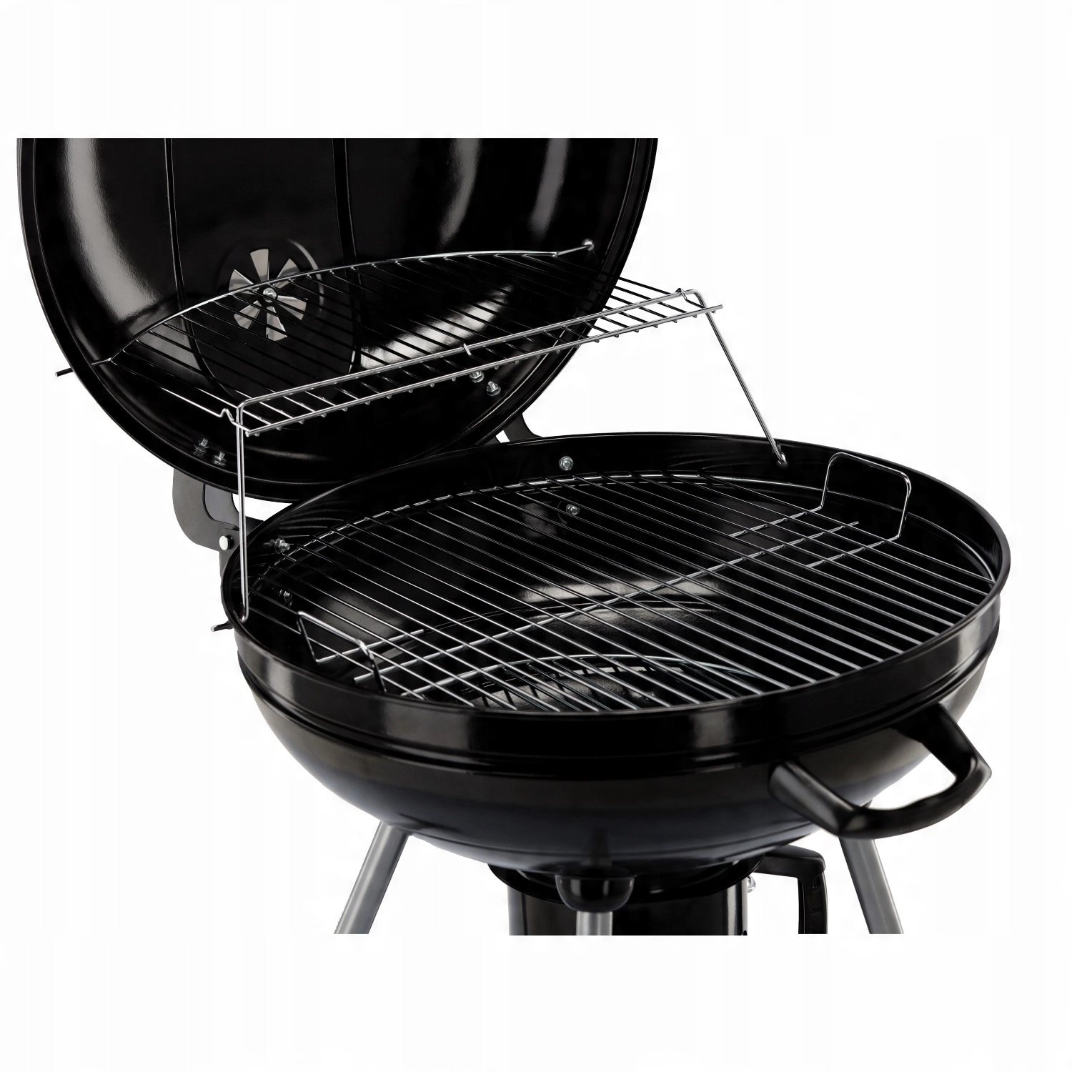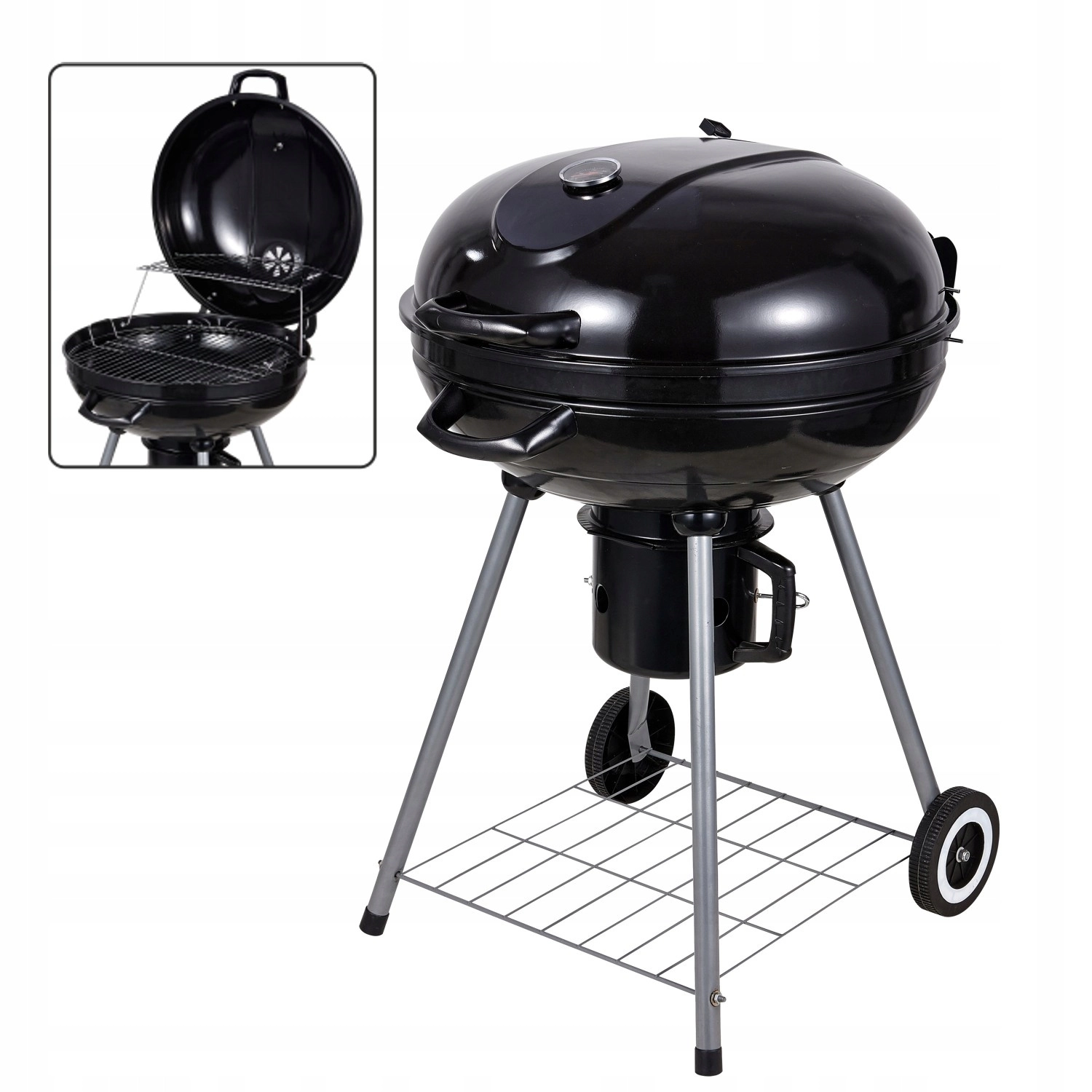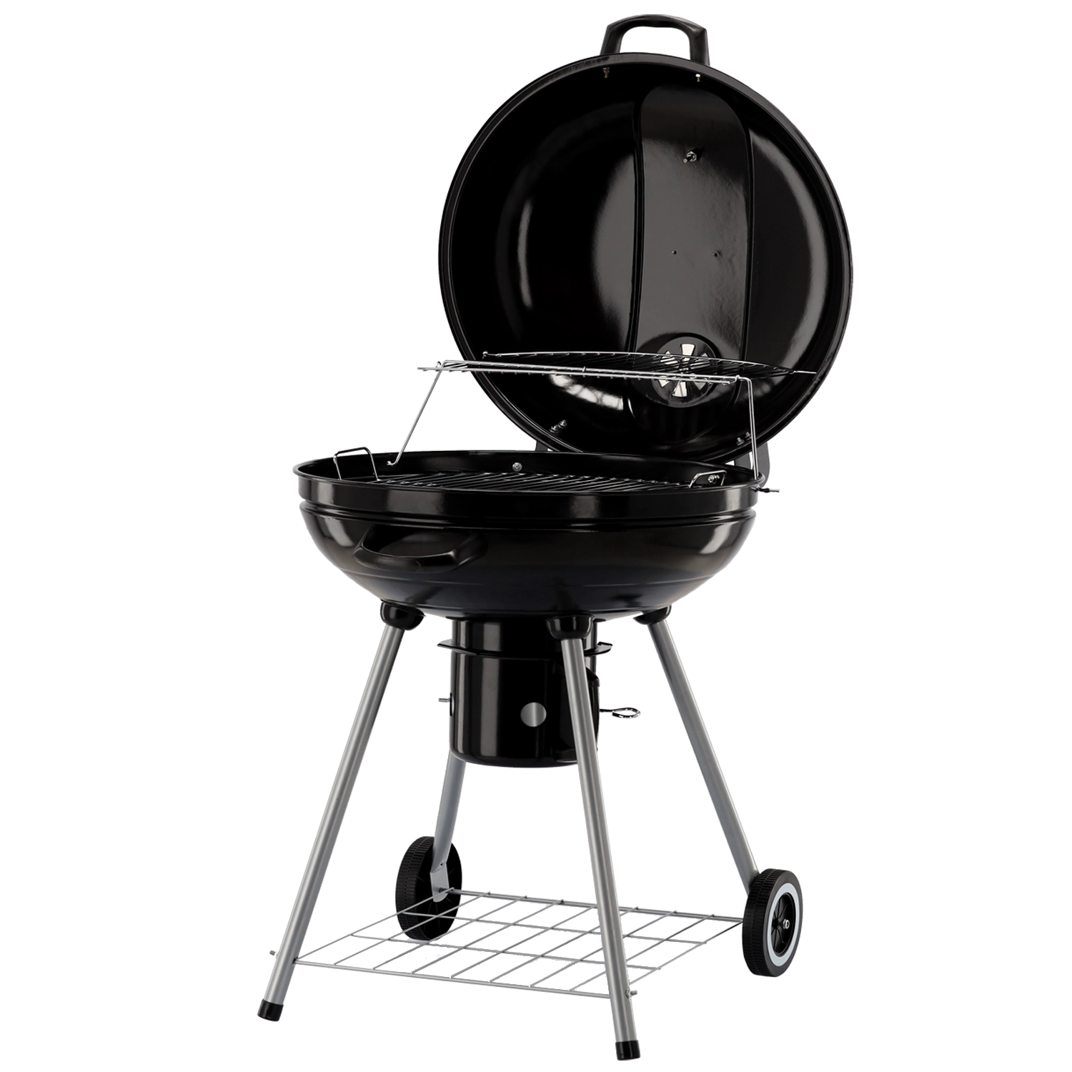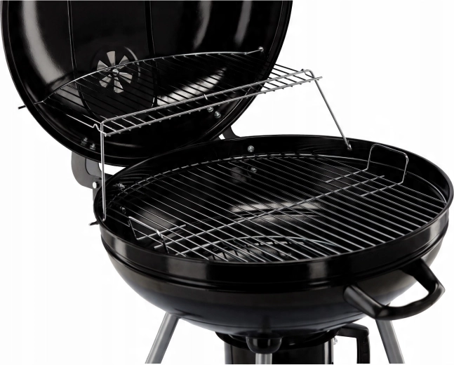 Hlavní chromovaný rošt o velkém průměru doplňuje horní ohřívací rošt, takže máte dostatek místa pro maso, zeleninu i přílohy. Popelník zachytí nečistoty a zjednoduší úklid po grilování, zatímco dvě kolečka umožní pohodlné přemístění grilu tam, kde ho právě potřebujete.