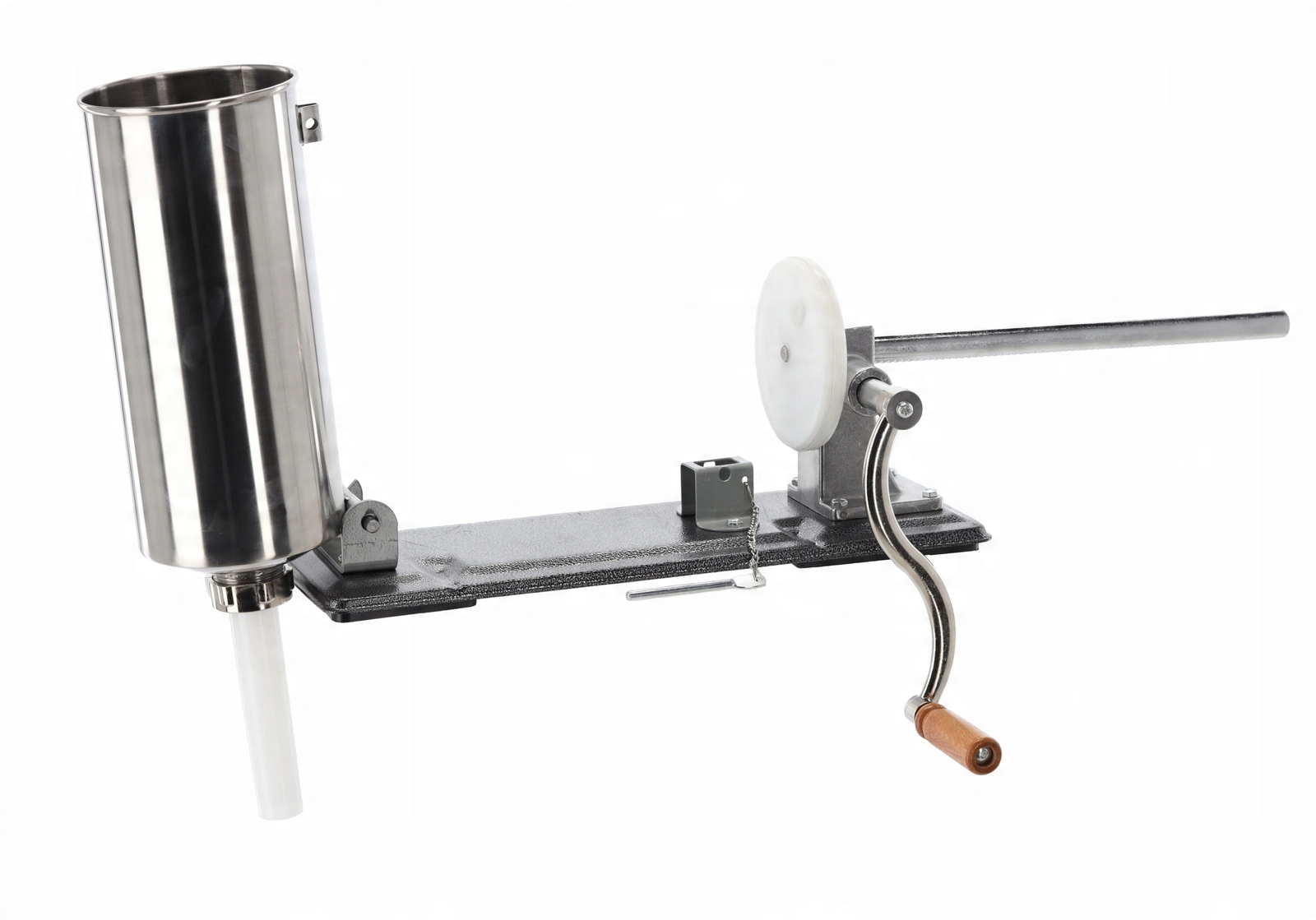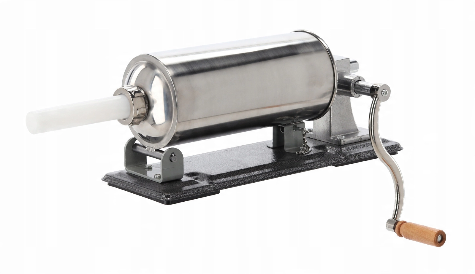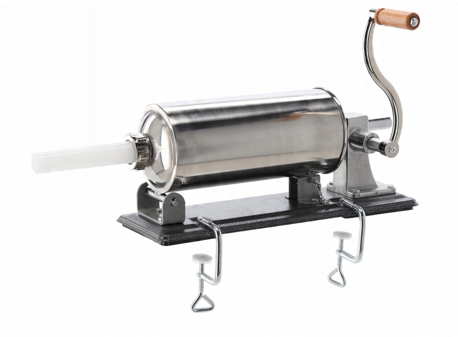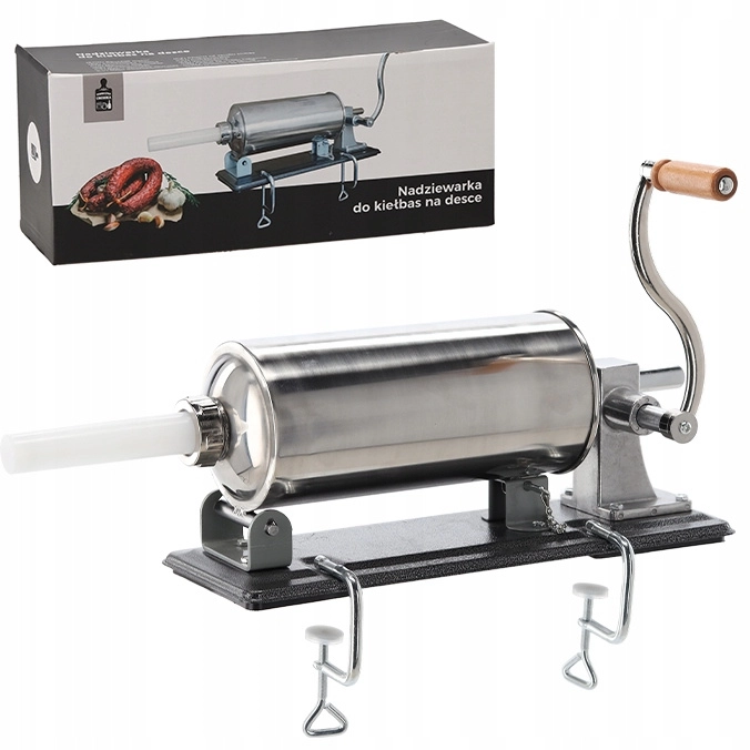 Vysokovýkonný ruční mechanismus umožňuje rovnoměrné a přesné plnění střev, zatímco stabilní litinová základna s pevným uchycením ke stolu zaručuje bezpečný provoz bez pohybu. Součástí je sada 4 nástavců (17, 21, 25 a 29 mm) pro různé druhy klobás – od tenčích párečků po silnější domácí klobásy.
