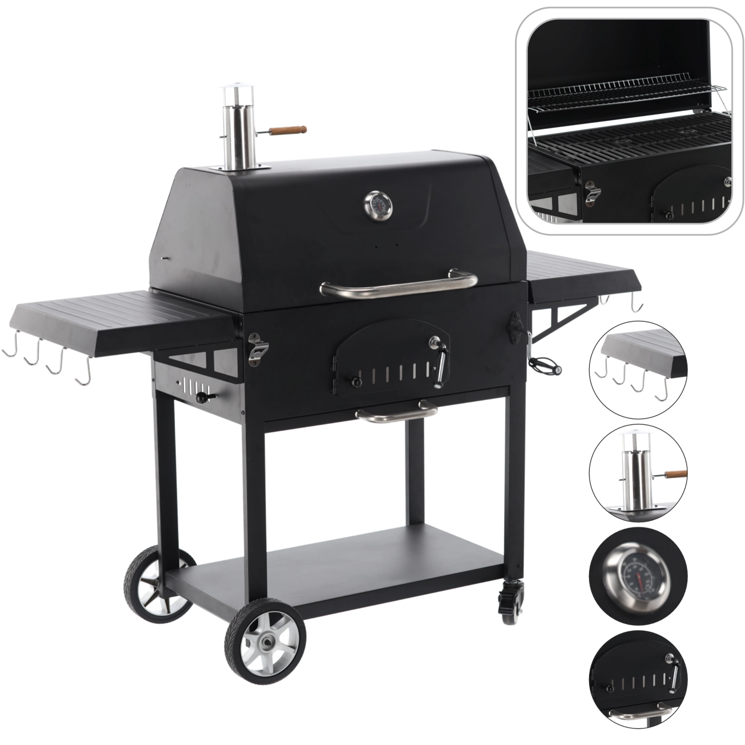 Dvě boční police pro přípravu, háčky na náčiní a spodní odkládací rošt. Kola a madla umožní snadno změnit místo grilování.