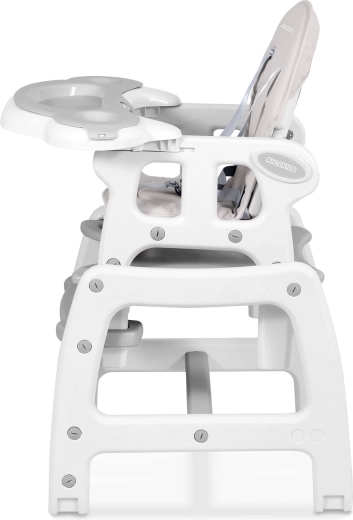 Židlička nabízí 5 praktických konfigurací: vysoká židlička s pultíkem, vysoká židlička bez pultíku, nízká židlička, samostatná židlička se stolkem a varianta pro větší děti. Třístupňové nastavení sklonu opěradla zvyšuje komfort, zatímco dvojitý odnímatelný tácek s vyvýšenými okraji a otvory na hrnečky brání převrhnutí nápojů.