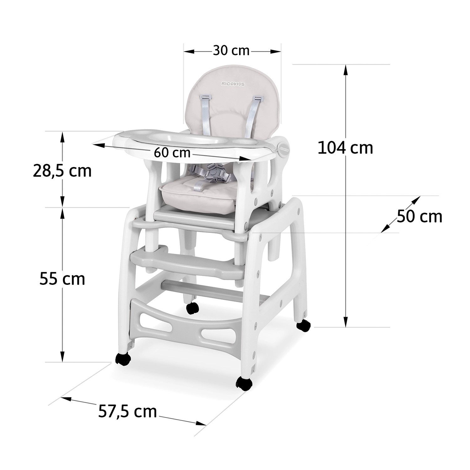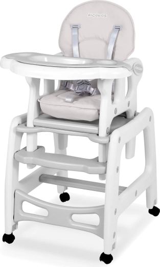 RICOKIDS Sinco je moderní a bezpečná dětská jídelní židlička, která se přizpůsobí každodenním rituálům krmení, hraní i učení. Díky pevné konstrukci, pětibodovým pásům a kolečkům s možností blokace poskytuje dítěti stabilitu a rodičům pohodlí. Měkké, široké sedátko s potahem imitujícím kůži se snadno čistí – nečistoty setřete hadříkem nebo pultík opláchnete pod tekoucí vodou.
