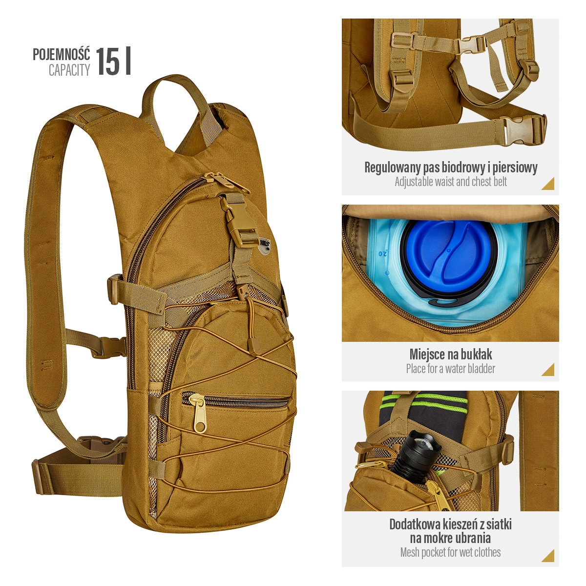 Kompaktní a odolný batoh o objemu 15 l pro jednodenní výlety, město i procházky. Nabízí přípravu na hydrovak s vývody na obě strany, více kapes pro přehlednou organizaci a lehký, voděodolný nylon v kombinaci s odolným polyesterem. Pro stabilní nošení nechybí hrudní a bederní pás, kompresní popruhy a vnější bungee šňůra pro helmu či karimatku.