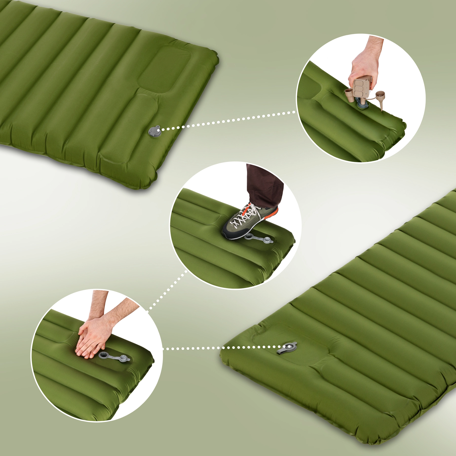 Horizontální vzduchové komory rovnoměrně rozkládají tlak těla a 10 cm výška zvyšuje pohodlí i tepelnou izolaci od chladné země.