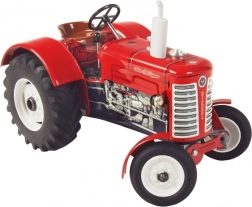 Klasický model traktoru Zetor 50 Super v měřítku 1:25 potěší sběratele i děti. Pohon zajišťuje pérový strojek na klíček, nechybí čtyřrychlostní převodovka, zpátečka, neutrál a ruční brzda. Přední náprava je řiditelná volantem a kovové provedení dodává hračce opravdovou bytelnost.