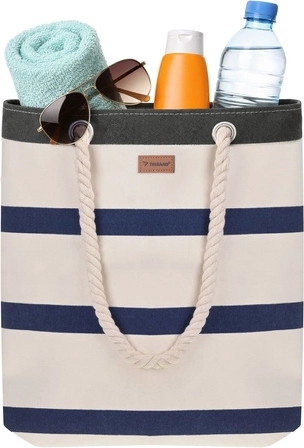 Užijte si léto bez starostí s plážovou taškou TRIZAND. Kombinuje nadčasový pruhovaný design s maximální funkčností: odolné plátno, pevné provazové úchyty a zip chrání obsah před pískem i nečistotami. Vnitřní kapsa udrží drobnosti po ruce, zatímco 18litrový objem pojme ručník, lahev s vodou i kosmetiku.