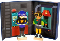 Tato chytrá magnetická sada přináší dětem hodiny zábavy a nekonečné možnosti kombinování. Z 27 magnetů vytvoříte přes 80 různých kostýmů – od odvážných superhrdinů až po bláznivé variace, které rozproudí dětskou fantazii. Dvě velké figurky lze postavit do přiložených dřevěných stojánků, takže si děti mohou se svými výtvory nejen hrát na stole, ale i je vystavit.