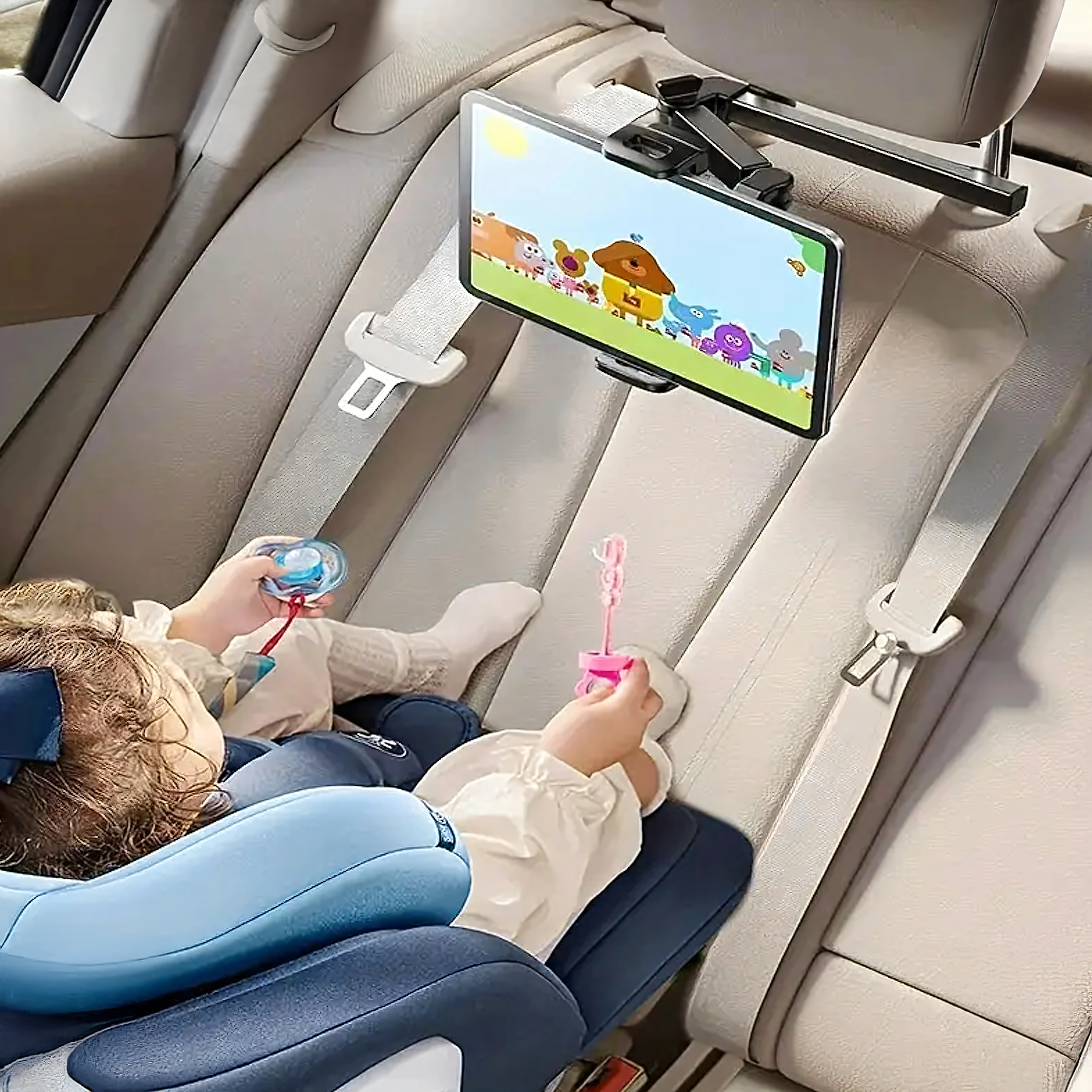 Držák se snadno přichytí mezi tyče opěrky hlavy a během pár minut je připraven pro zadní cestující – bez nářadí.