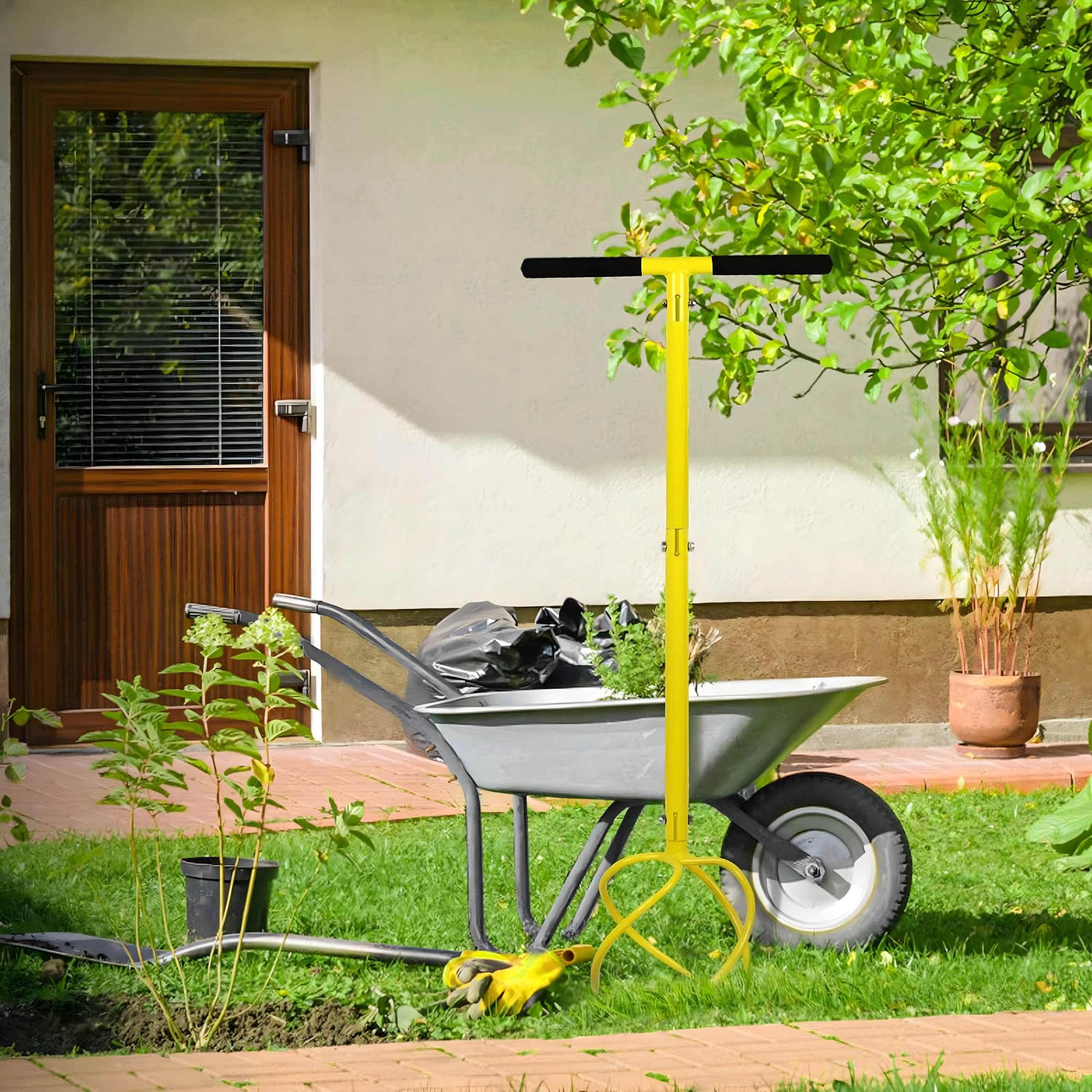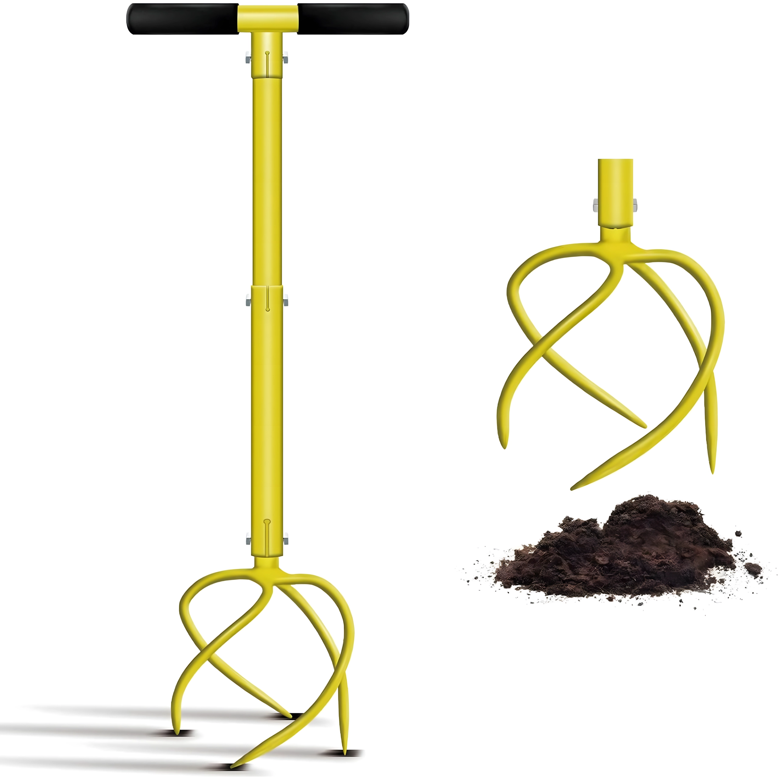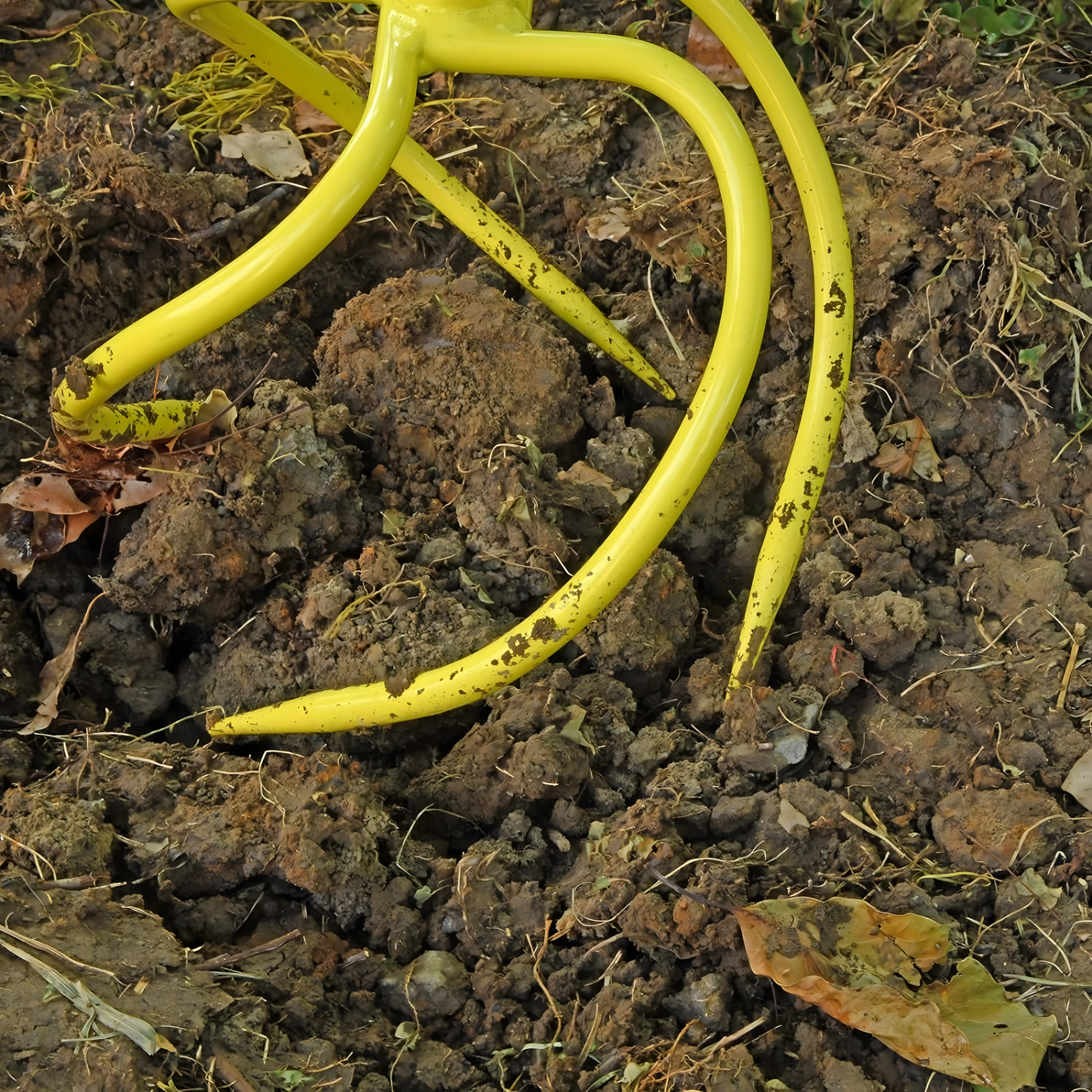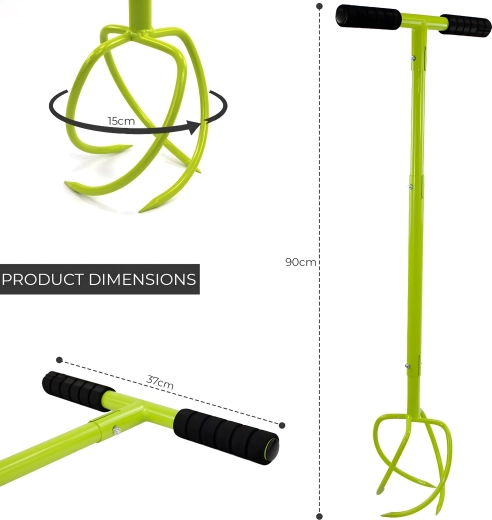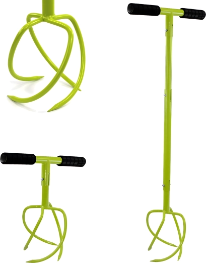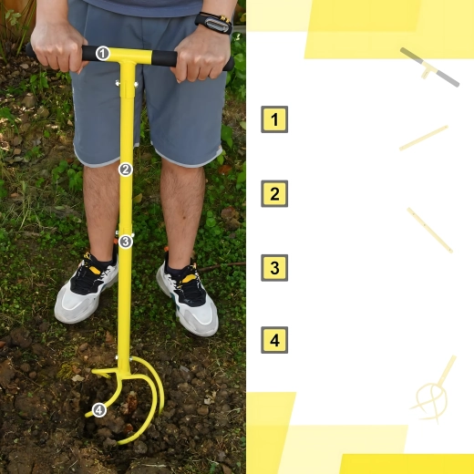 Robustní kovová konstrukce s zakřivenými/spirálovými hroty proniká do půdy, rozbíjí hrudky a pomáhá zapravovat kompost či hnojivo. Jasná barva nástroje zvyšuje viditelnost na zahradě, takže jej vždy snadno najdete.