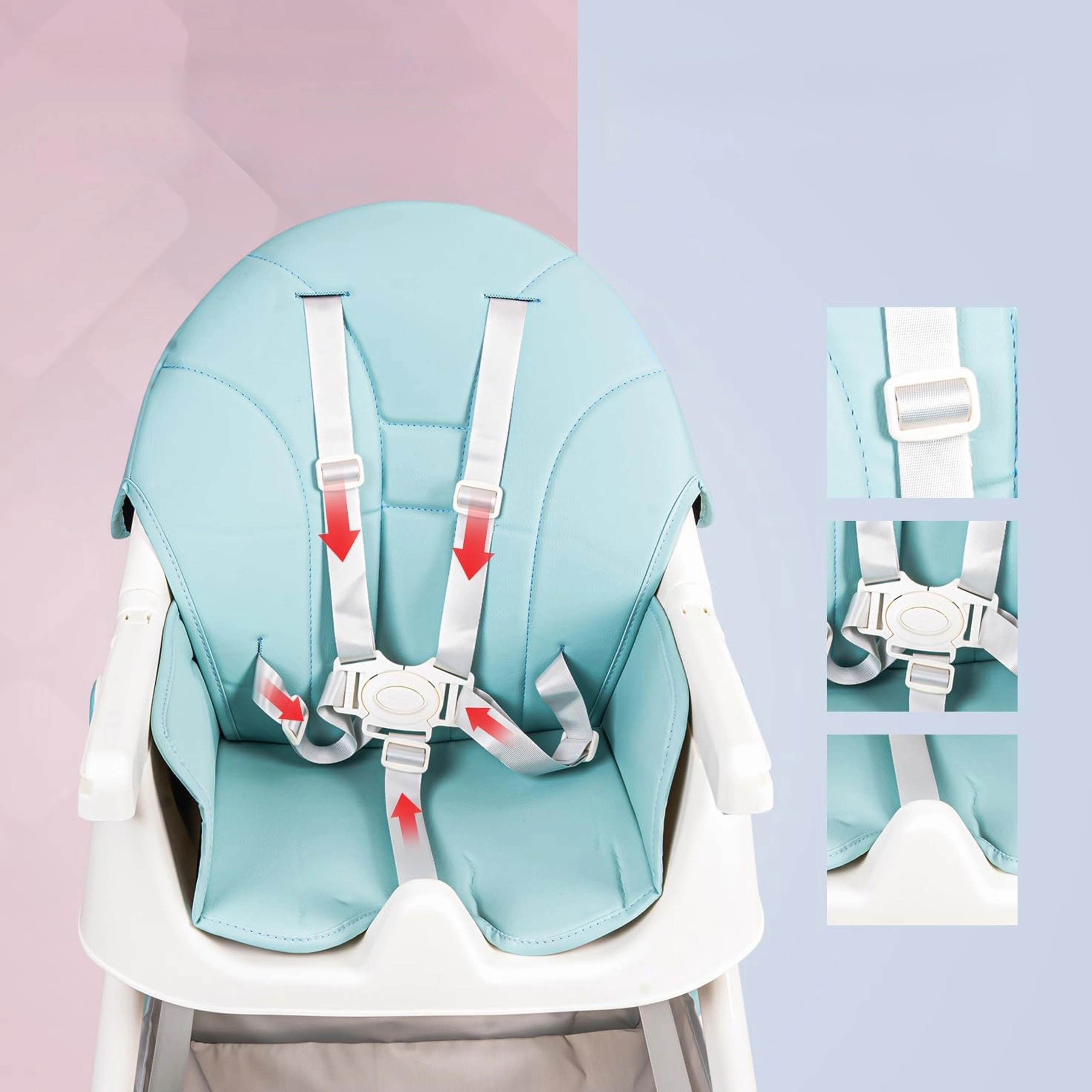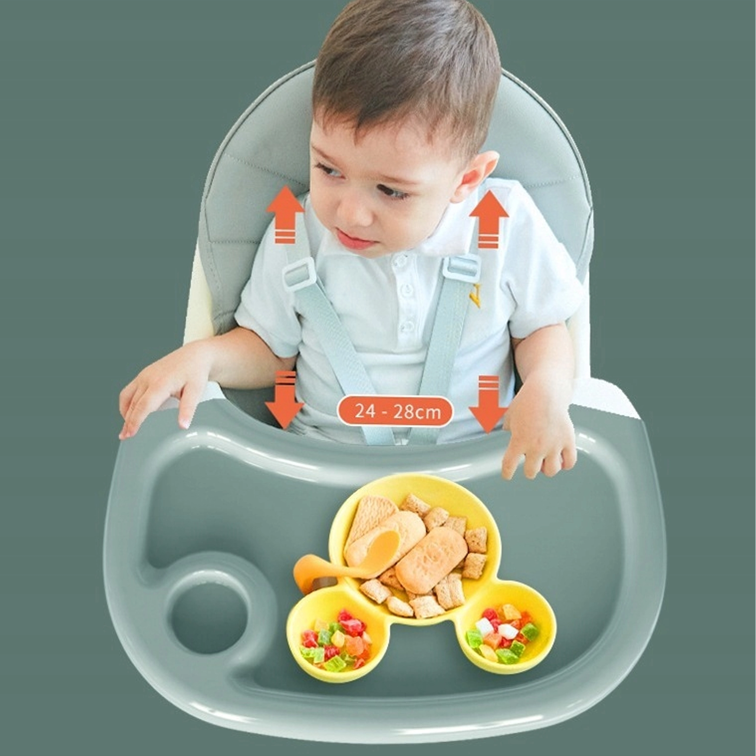 Tvarované sedátko, měkké polstrování, 5bodový pás a rozkrokový doraz drží dítě stabilně a pohodlně při jídle i hraní.