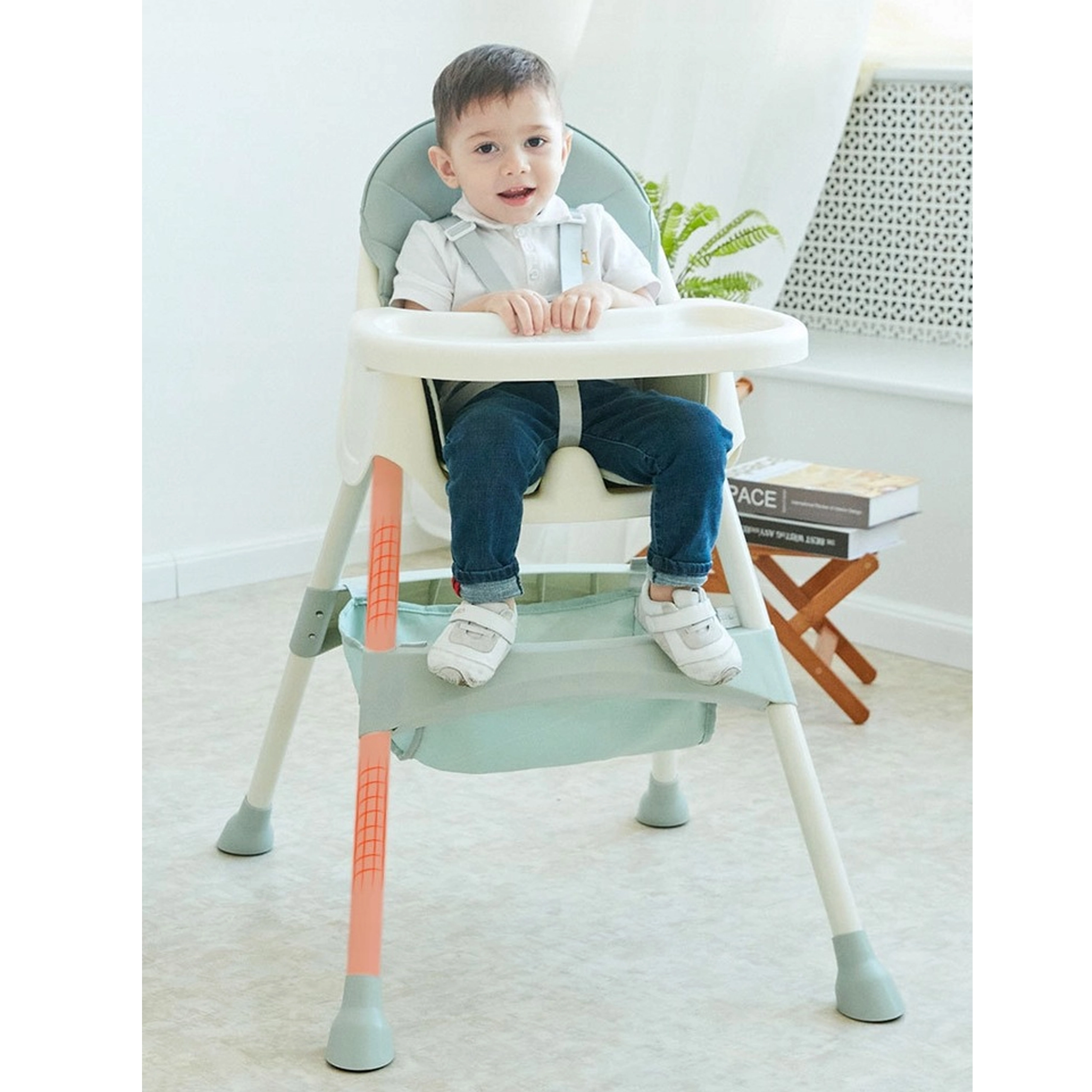 Bezpečnost zajišťuje 5bodový pás, tvarované sedátko s rozkrokovým dorazem a stabilní rozkročené nohy s protiskluzovými koncovkami. O pohodlí se stará měkké polstrování, dítě má navíc k dispozici opěrku nohou. Praktický úložný košík pod sedákem pojme pleny, bryndáky i hračky.