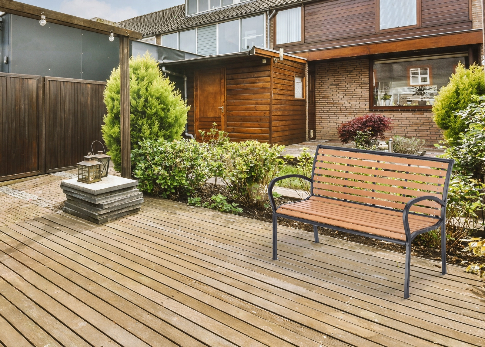 Plastové lamely v hnědém dekoru vypadají jako dřevo, ale lépe snášejí déšť a slunce a vyžadují jen minimální údržbu.