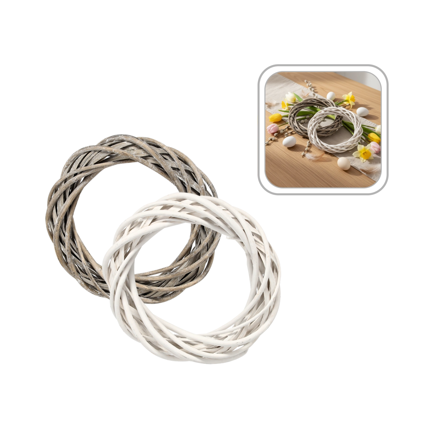 Vytvořte si originální dekoraci během chvilky. Tento proutěný věnec v nadčasových neutrálních odstínech bílé nebo šedé se hodí do moderních i rustikálních interiérů. Je pevný, lehký a připravený k dozdobení podle vaší fantazie – od jarních květin přes podzimní listí až po vánoční ozdoby.