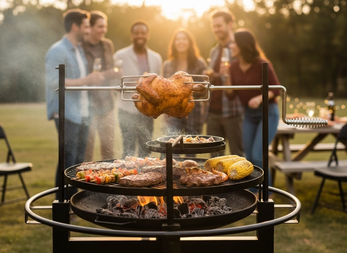 Multifunkční gril s otočným rožněm je ideální volbou pro všechny milovníky venkovního vaření. Nabízí velkorysé rozměry 90 × 86 × 99 cm, stabilní provedení a pohodlné používání, díky čemuž snadno připravíte křupavé kuře, šťavnaté steaky i zeleninu s autentickým aroma.