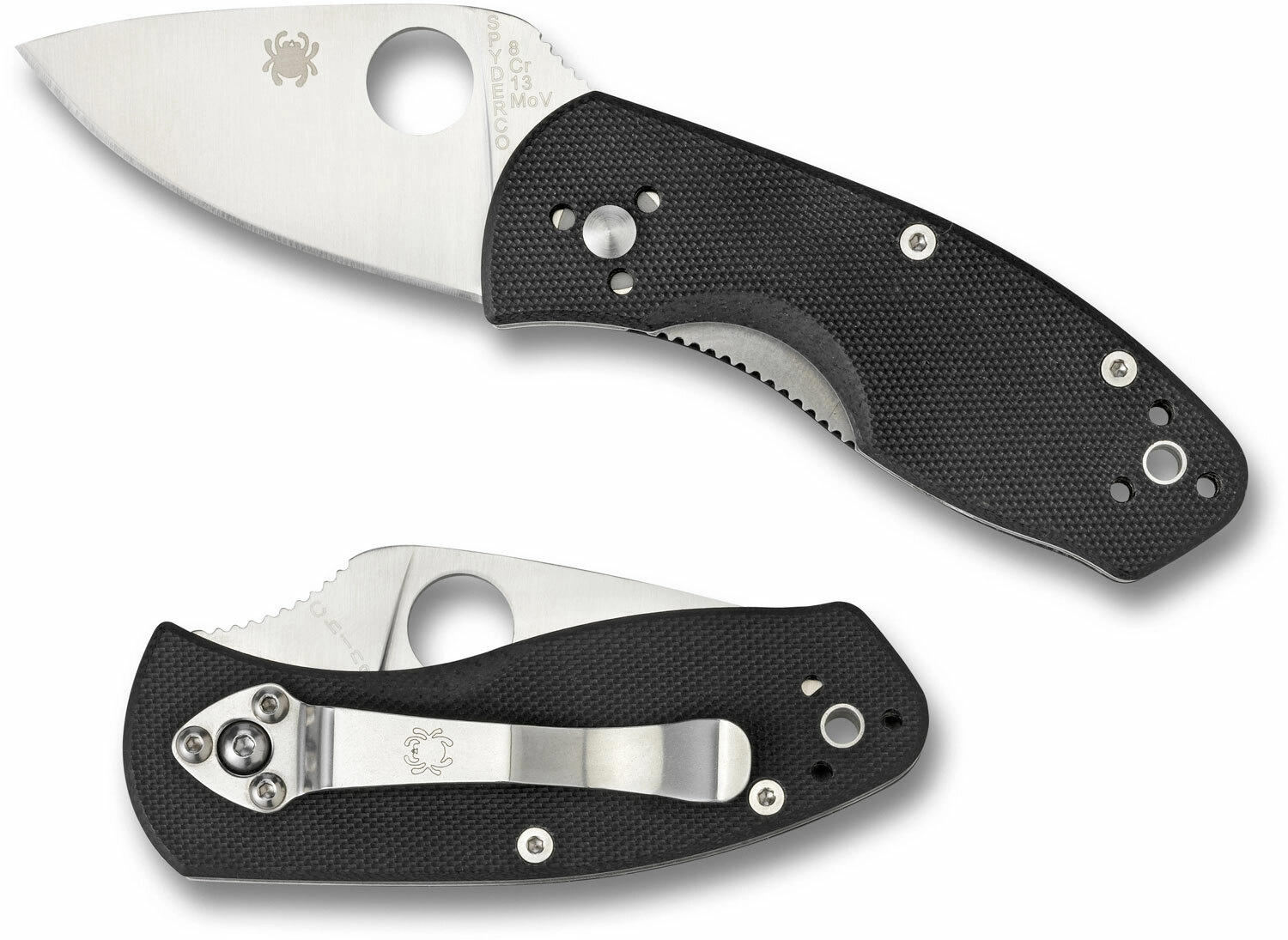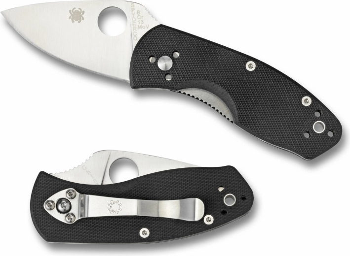 Otevření je rychlé a intuitivní pomocí charakteristického palcového otvoru ve stylu Spyderco. Pojistka Liner Lock drží čepel pevně v pracovní poloze. Ergonomická rukojeť z černého laminátu G10 nabízí jistý úchop, doplňuje ji klip pro nošení v kapse a otvor pro paracord či závěsné poutko.