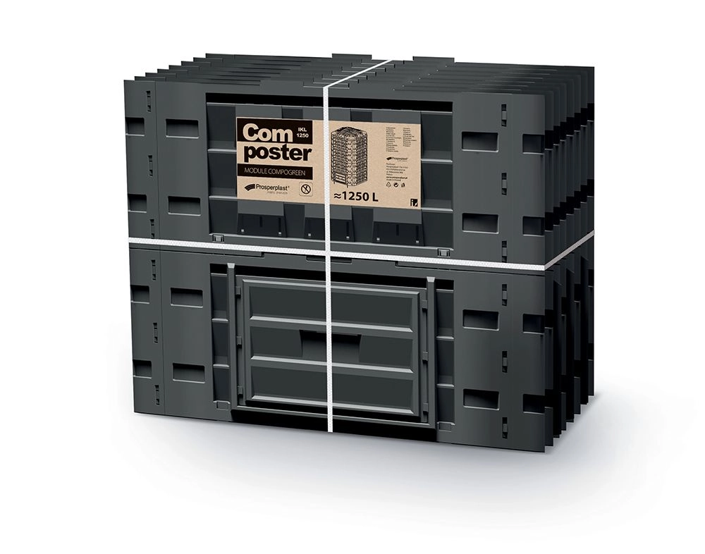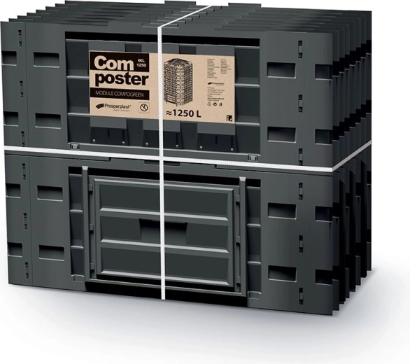 Compogreen Vario 1250 l je velkoobjemový kompostér navržený pro stabilní, rychlé a hygienické kompostování velkého množství bioodpadu. Modulární stěny s ventilačními štěrbinami zajišťují správnou cirkulaci vzduchu, která urychluje proces rozkladu a omezuje zápach. Horní víko usnadňuje přísun materiálu, spodní dvířka umožňují pohodlný odběr hotového kompostu.